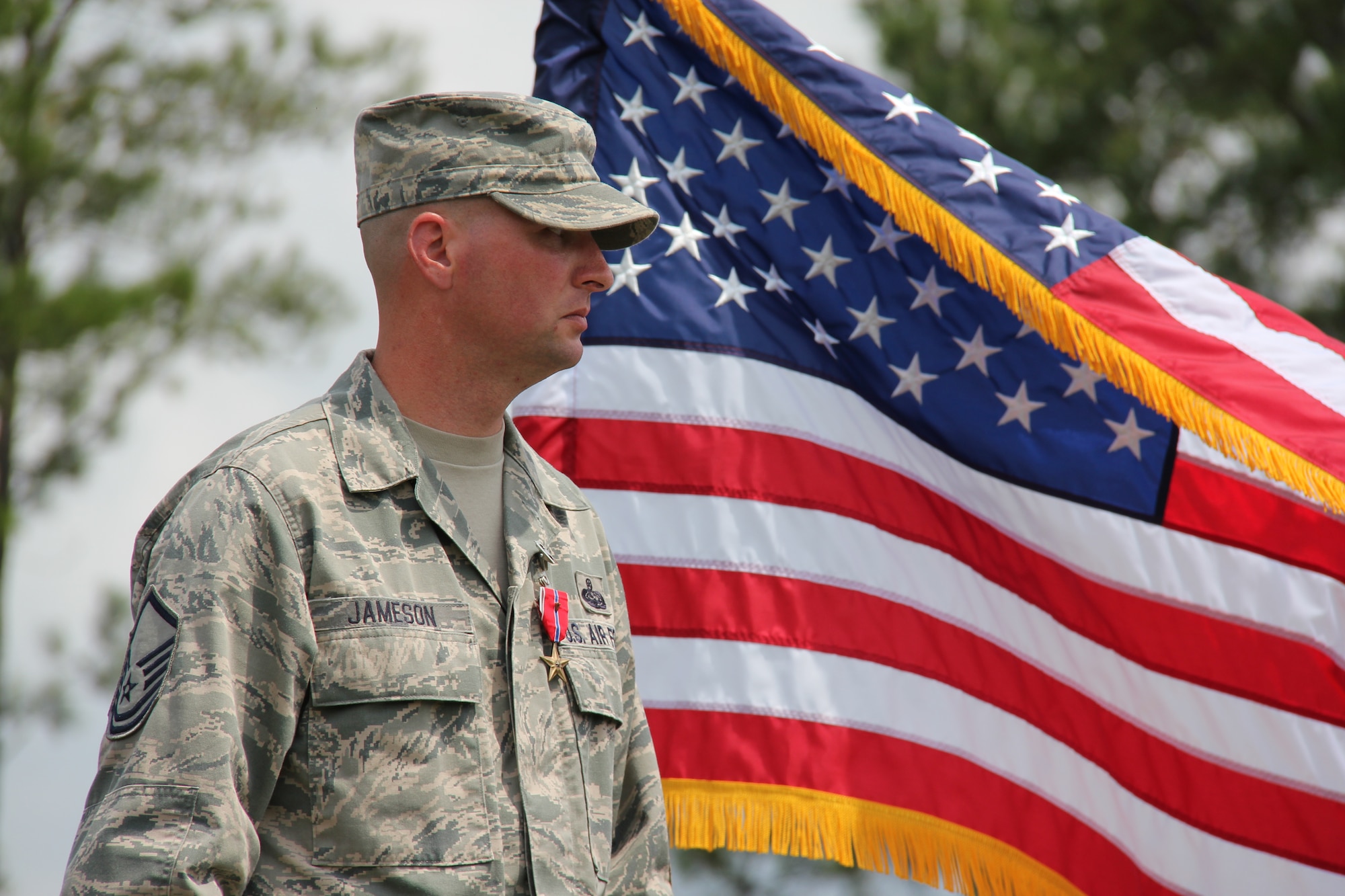 Master Sgt. Gene Jameson, III, and his wife Jessica, discuss his Bronze Star with Valor with members of the wing sitting in the stands after the awards ceremony at Robins Air Force Base, Ga., Aug. 23, 2012. Jameson was awarded the medal for his actions while deployed to Bagram, Afghanistan. (U.S. Air Force photo/Robert Talenti)