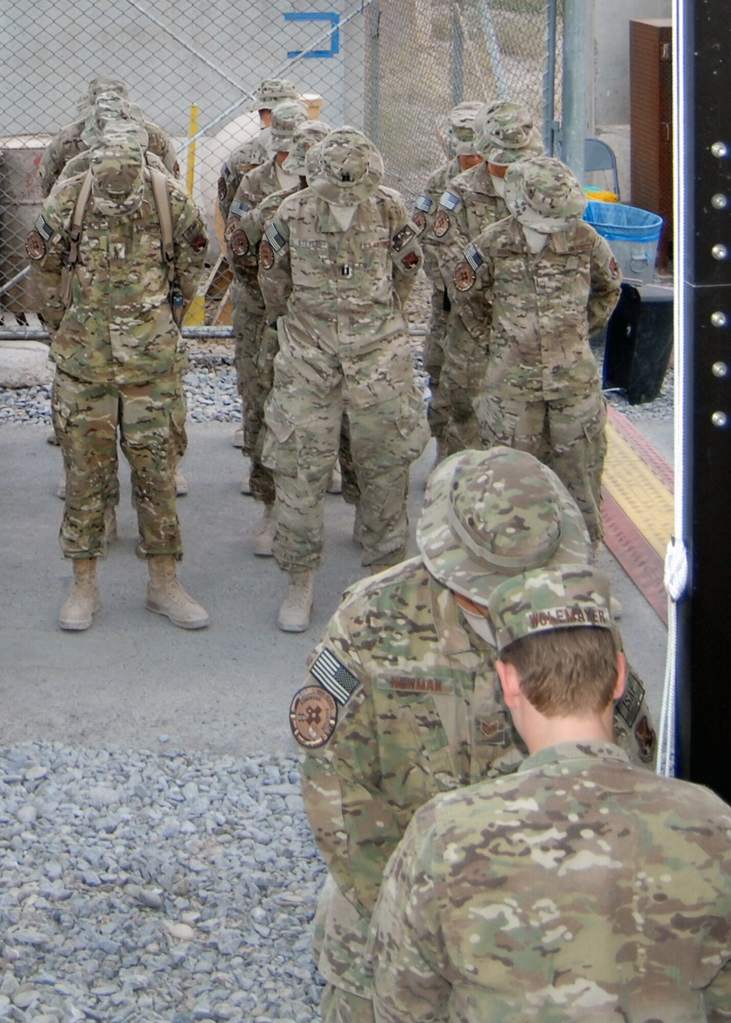 Staff Sgt. Michael Newman presents the flag to Staff Sgt. Kristy Wolfmayer, marking the end of retreat at Kandhar Airfield, Afghanistan, Aug. 4, 2012. Wolfmayer's father, John Woflmayer from Califon, N.J., designed, built and shipped the flagpole to Kandahar Airfield. Newman and Wolfmayer are with the 651st Expeditionary Aeromedical Evacuation Squadron. (U.S. Air Force photo/Master Sgt. Russell Martin)