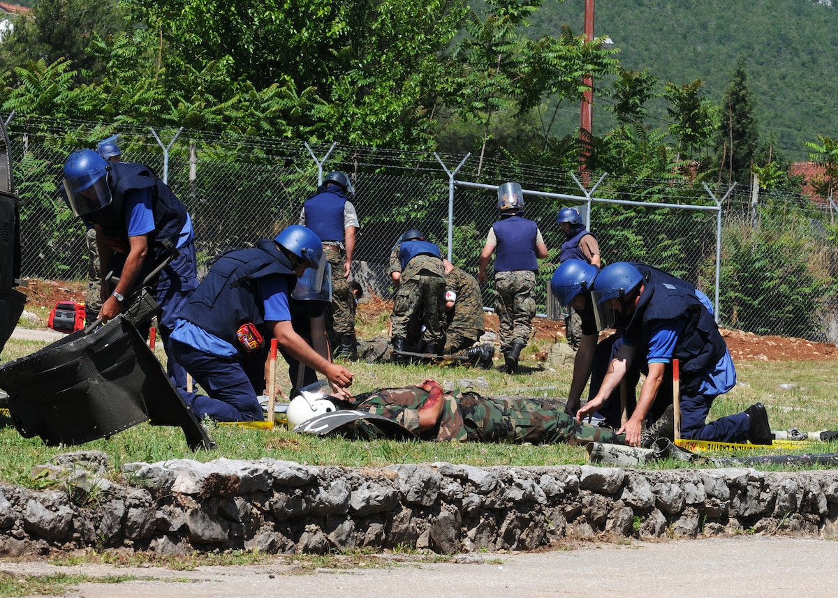 U.S. Air Force Capt. Brian Davis, right, and Maj. Andy Ebert, middle, discuss a patient's injury during Shared Resilience 2012 at Capljina, Bosnia-Herzegovina, June 5, 2012. The goals of the exercise are to strengthen interoperability, facilitate training in crisis response and disaster management, and validate the readiness of deployable military medical and humanitarian assistance teams. Davis and Ebert are both from Royal Air Force Lakenheath, England. (U.S. Air Force photo/Staff Sgt. Daryl Knee)
