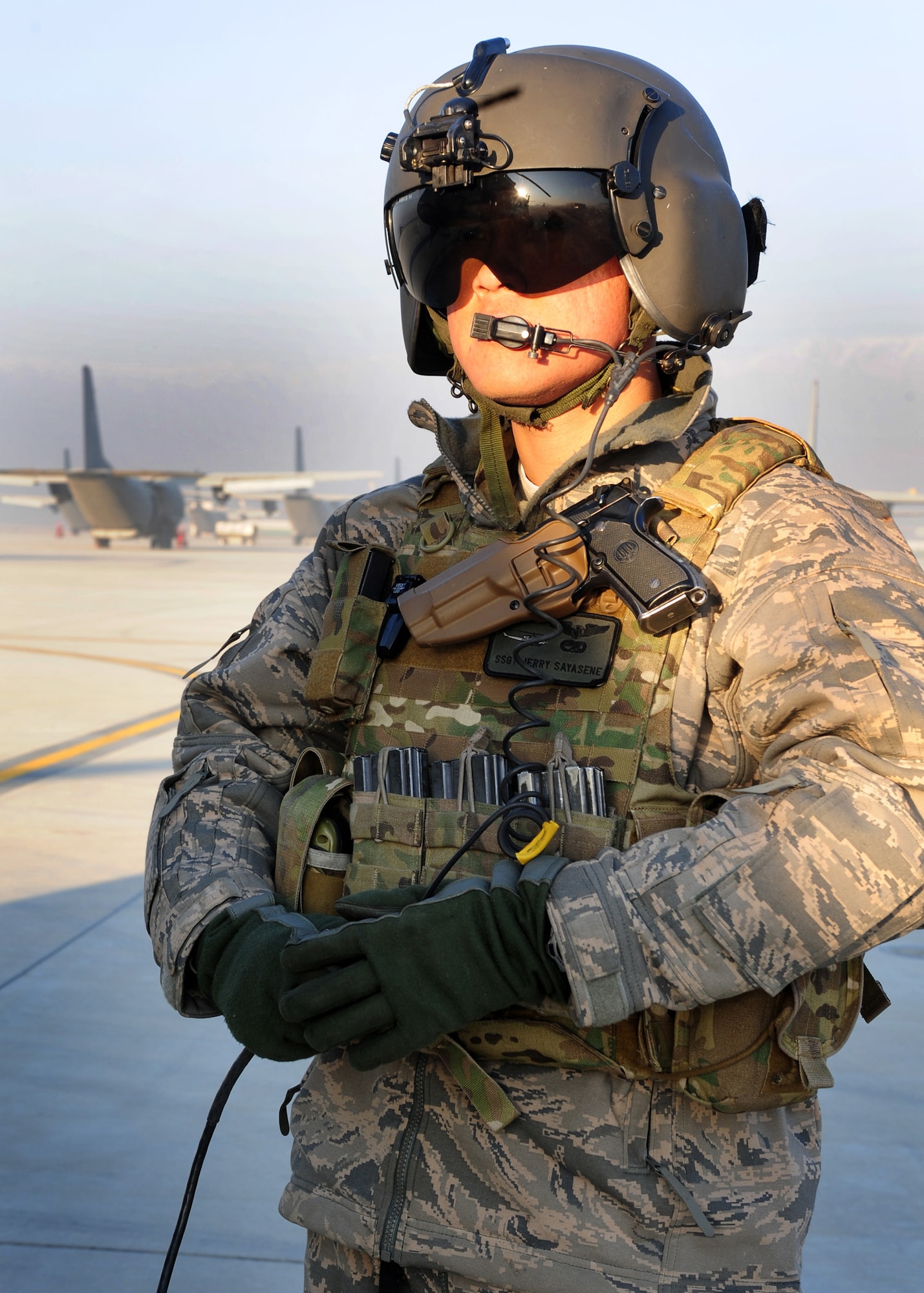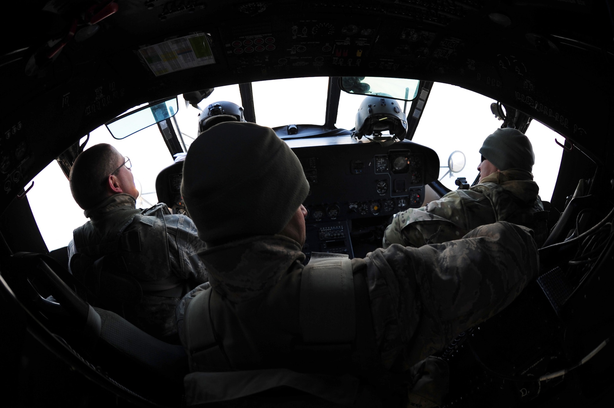Tech. Sgt. Jerry Sayasene, a flight engineer with the 438th Air Expeditionary Advisory Squadron, performs a communication check with the pilot of an Afghan air force MI-17 prior to a supply flight over northern Afghanistan, Dec. 21, 2011, at Kabul International Airport. Sayasene is currently deployed to provide advisory training for Afghan air force flight engineers. (U.S. Air Force photo by Staff Sgt. Nadine Y. Barclay)