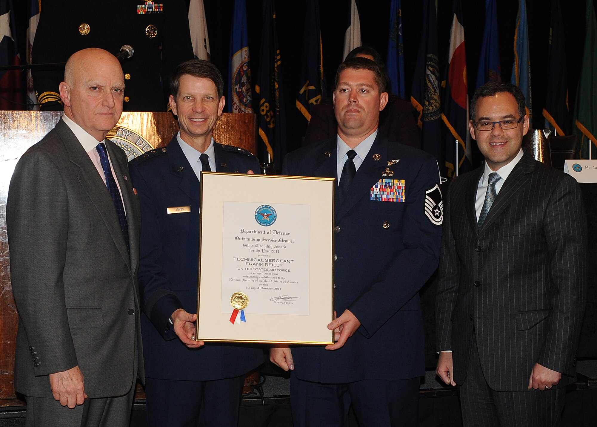 Dr. Robert Rudney receives his Department of Defense Outstanding Employee with a Disability award Dec. 6, 2011, from John R. Campbell, Lt. Gen. Darrell Jones and Daniel Ginsberg during the 31st Annual DOD Disability Awards ceremony at the Hyatt Regency Hotel in Bethesda, Md. The award highlights the valuable contributions to national security made by individuals with disabilities. Rudney is the senior adviser and learning integration research liaison, Campell is the Deputy Assistant Secretary of Defense for Wounded Warrior Care and Transition Policy, Jones is the Air Force deputy chief of staff for manpower, personnel and services and Ginsberg is the Air Force assistant secretary for manpower and reserve affairs. (U.S. Air Force photo/Master Sgt. Raheem Moore)