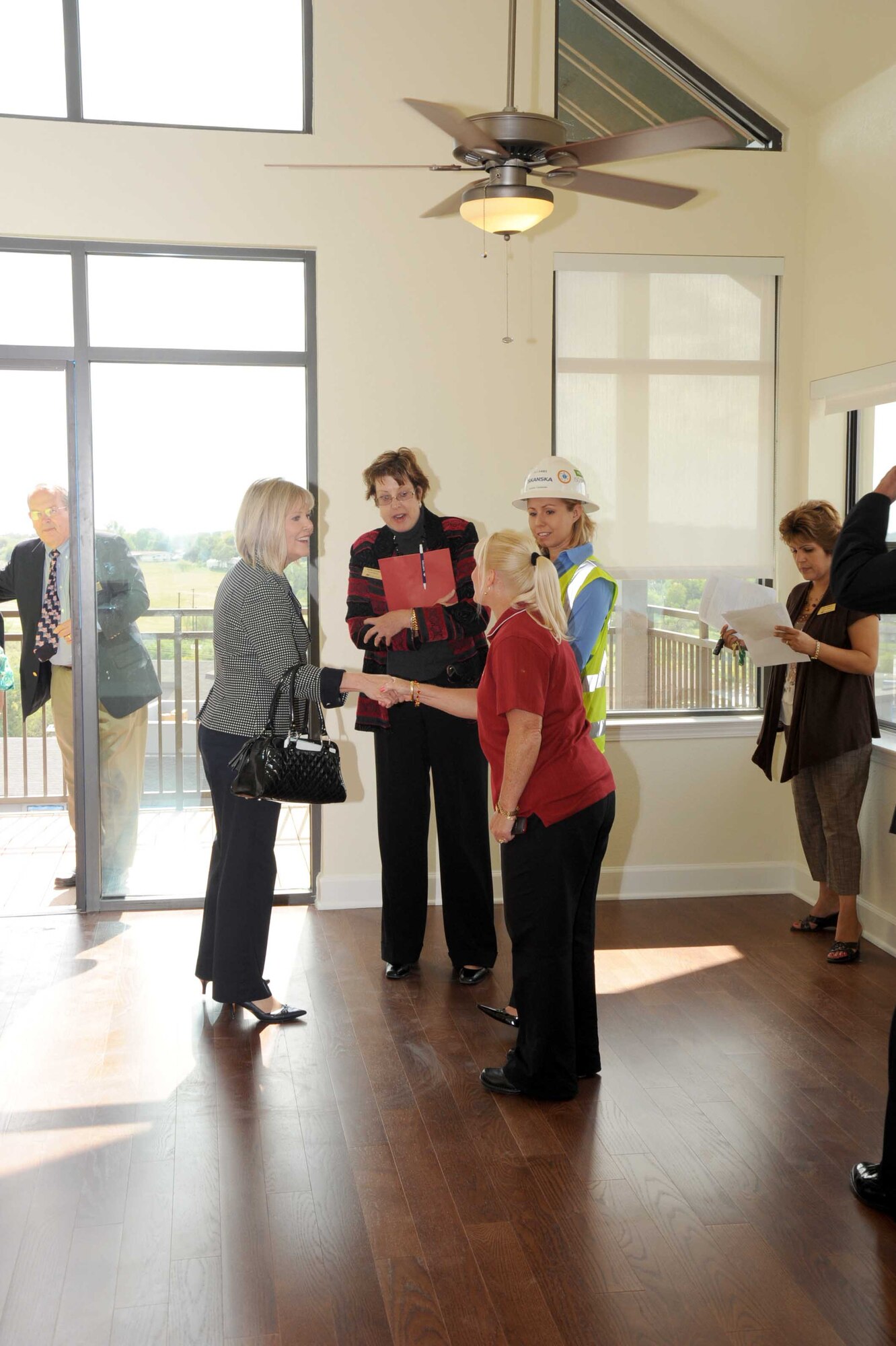 Suzie Schwartz meets with (left to right) Kathleen Estrada, executive director of Air Force Village I; Audra Tiemann, project engineer for Skanska; and Debbie Zazeela, fitness manager for AF Village, Oct. 22, 2010, for a tour of the newly refurbished Air Force Village I in San Antonio. Mrs. Schwartz, the wife of Air Force Chief of Staff Gen. Norton Schwartz, helped rededicate Air Force Village I later in the day. (Air Force photo)