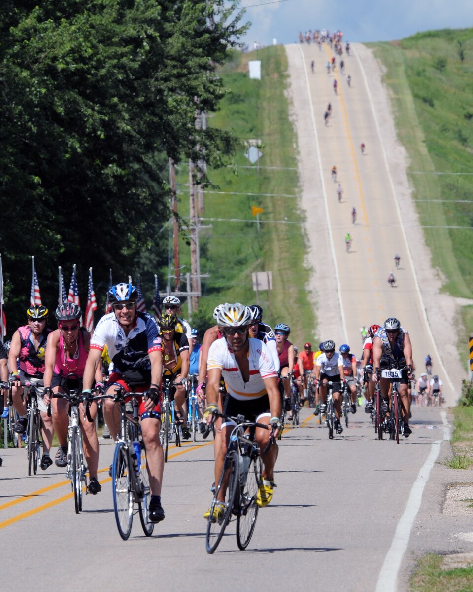Members of the Air Force Cycling Team near the top of the first hill of the day as they begin to pedal across Iowa during The Register's Annual Great Bicycle Ride Across Iowa, also known as RAGBRAI. Riders from throughout the Air Force came to Sioux City, Iowa, located on the Missouri River to the west, to start their trek that would take them seven days and 442 miles east to get to Dubuque, Iowa, and the Mississippi River. (U.S. Air Force photo)