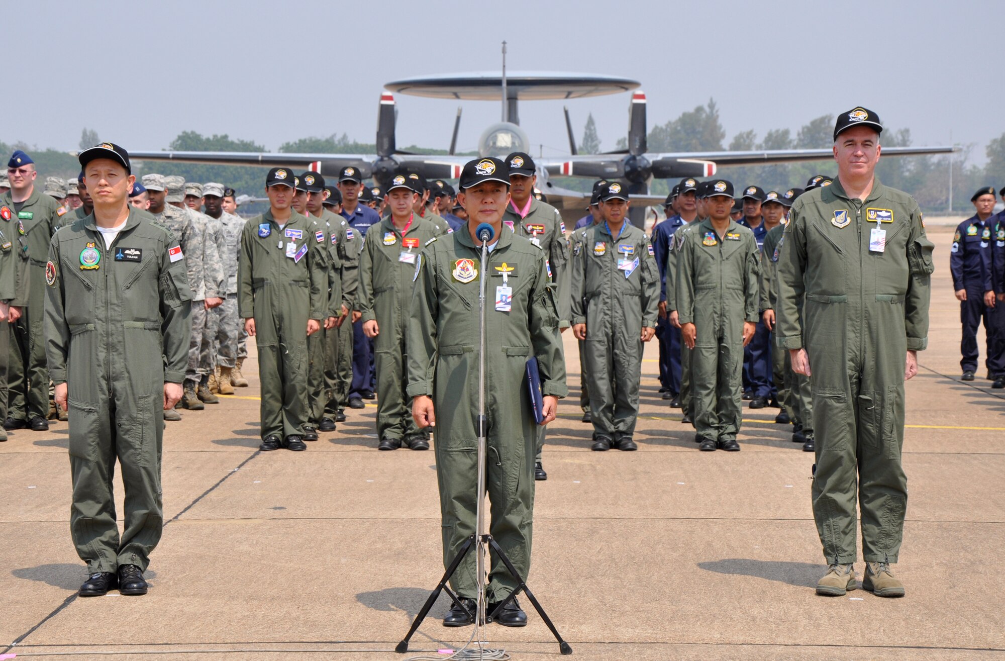 Gen. Gary North walks with Air Chief Marshal Itthaporn Subhawong (left) and Brig. Gen. Ng Chee Meng (right) in front of a formation of U.S., Singaporean and Thai military personnel on the last day of the Cope Tiger exercise March 12, 2010, at Korat Royal Thai Air Force Base, Thailand. General Meng is the Republic of Singapore Air Force chief of air force, Air Chief Marshal Subhawong is Royal Thai Air Force commander in chief and General North is the Pacific Air Forces commander. (U.S. Air Force photo/Capt. Christy Stravolo)