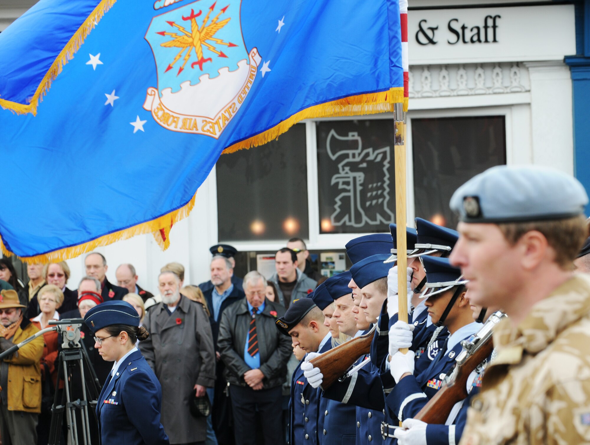 The Air Force-blue uniforms of Cols. Lawrence Reed (left), Chad Manske (middle) and Maj. Gen. Mark Zamzow stand out among local dignitaries at a Remembrance Day ceremony Nov. 9, 2009, at Angel Hill, Bury St. Edmunds, England. General Zamzow, 3rd Air Force vice commander, presented a poppy wreath along with Colonel Manske, 100th Air Refueling Wing commander, and Colonel Reed, 48th Fighter Wing vice commander, at the base of a memorial. British and American forces participated in the event that was one of thousands across the country. (U.S. Air Force photo/Senior Airman Thomas Trower)