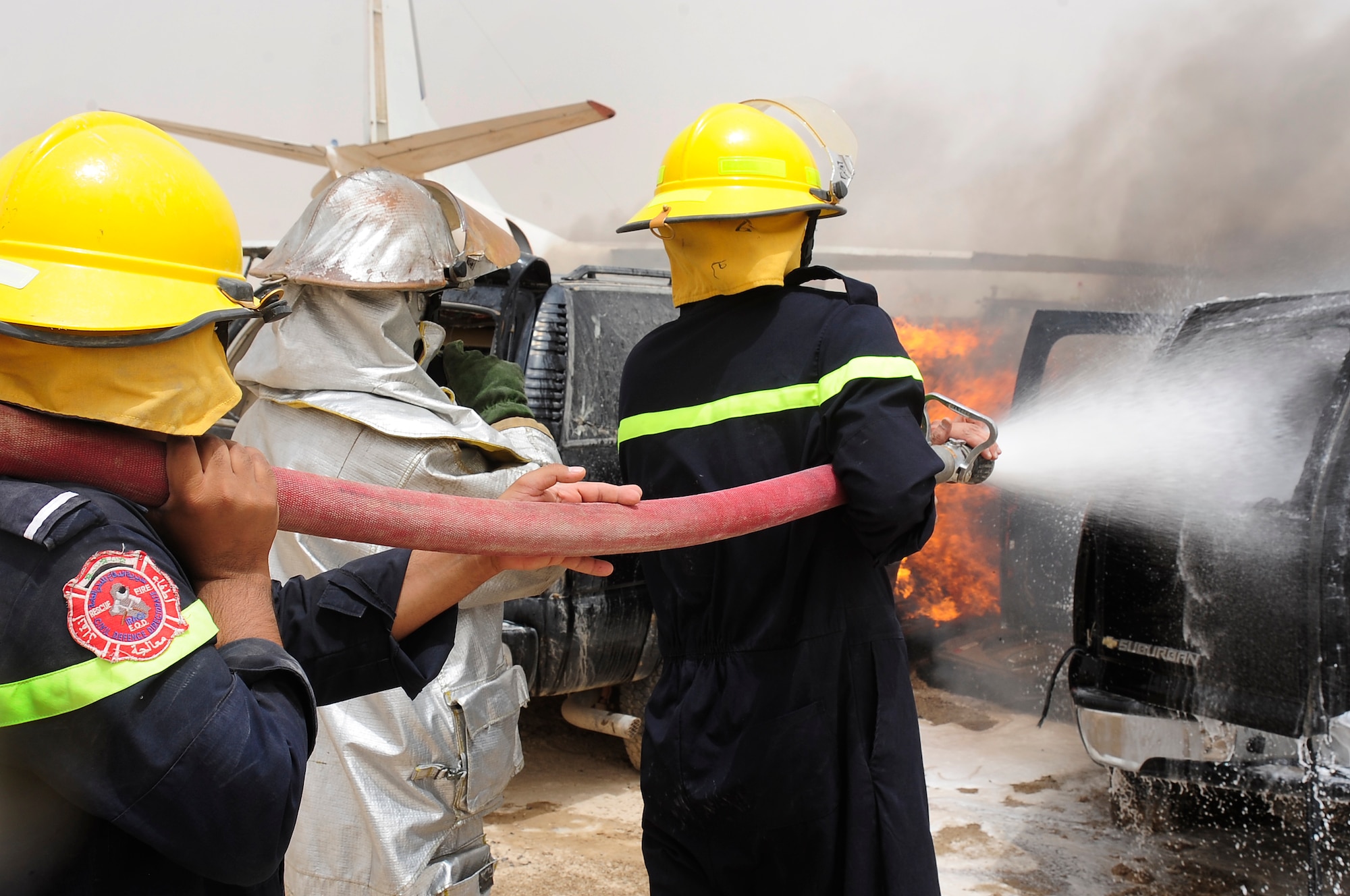 Airman 1st Class DeMario Greene and Lt.Col. Derek Scott, both with 407th Civil Engineer Squadron from Ali Base, Iraq, and Iraqi army Col. Muhammad Abd Al-Muhssan Khalaf Mahd, commander of the 10th Iraqi Army Division, assist in off loading fencing material at Camp Mittica, Iraq, Oct. 14, 2009. The fencing was part of a significant donation of building materials made by the squadron to the 10th IAD. (U.S. Air Force photo/Senior Airman Tony R. Ritter)