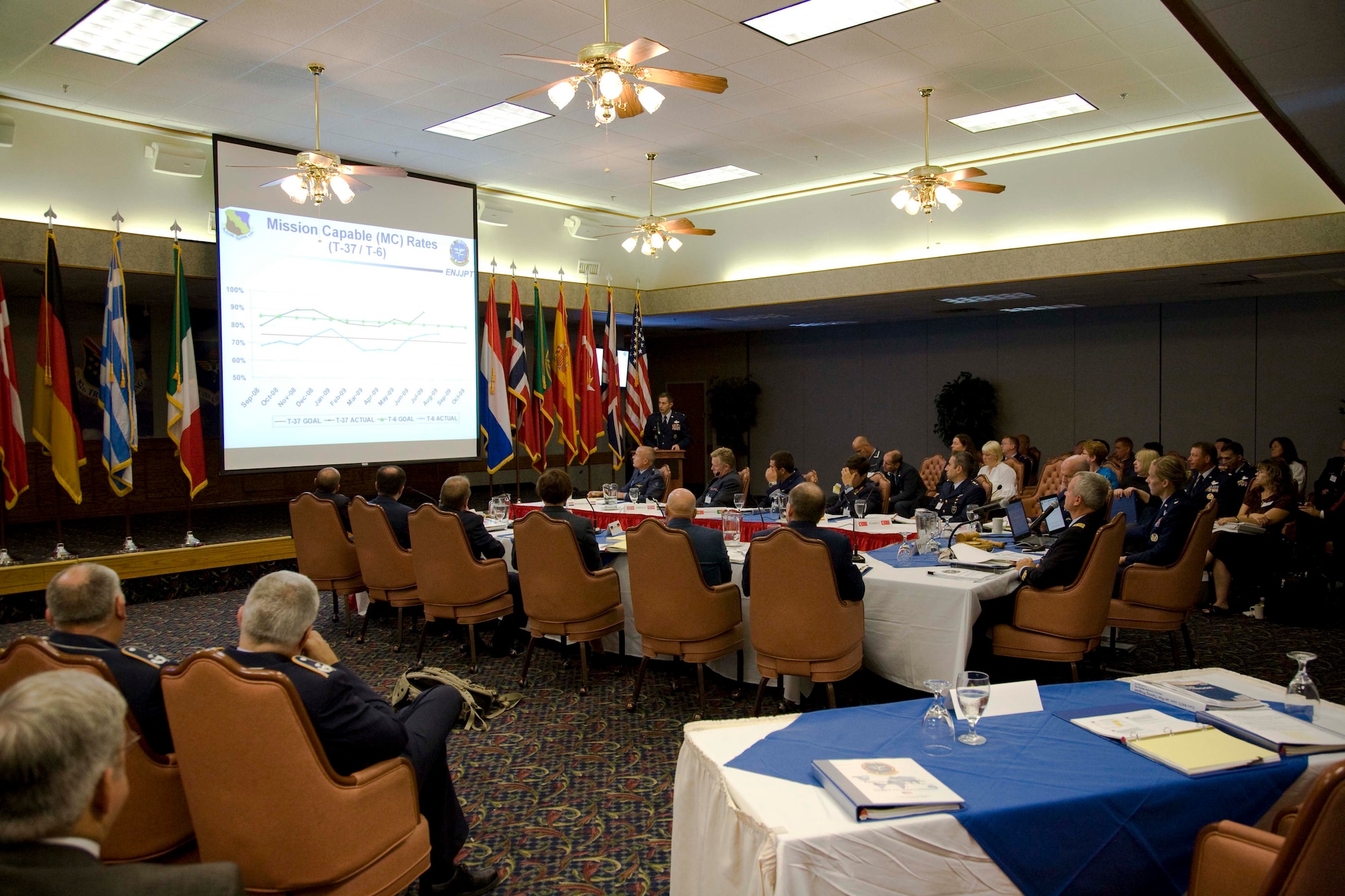 Col. Kevin Schneider, 80th Flying Training Wing commander, provides a wing update briefing to the attendees of the Euro-NATO Joint Jet Pilot Training Program Steering Committee Sept. 25, 2009, at Sheppard Air Force Base, Texas. Members discussed the flow of student pilots, instructor pilot training, leadership and command opportunities, maintenance statistics and plans for ENJJPT. (U.S. Air Force photo/Lt. Col. Ternell Washington)