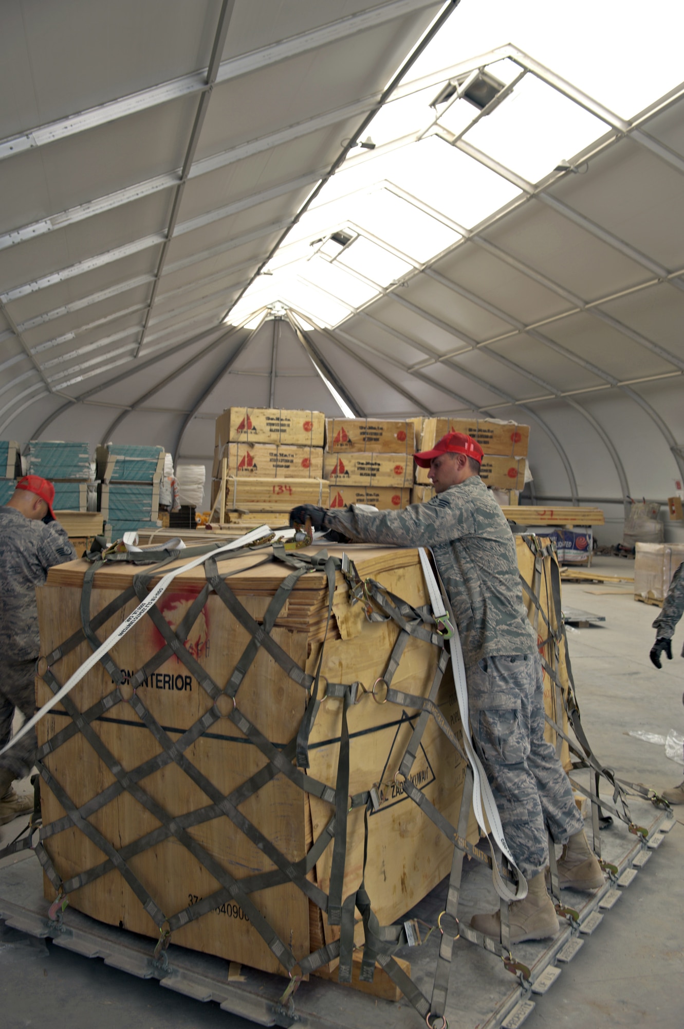 Senior Airman Ryan McGraw guides a pallet of wood onto weight scales in order to have it shipped Sept. 15, 2009, at an air base in Southwest Asia. Airman McGraw is a 1st Red Horse Group structural journeyman. He along with fellow members of the logistics and pallet build-up team, support all Red Horse operations downrange by obtaining and shipping required equipment. Airman McGraw is deployed from Dyess Air Force Base, Texas. (U.S. Air Force photo/Staff Sgt. Robert Barney)