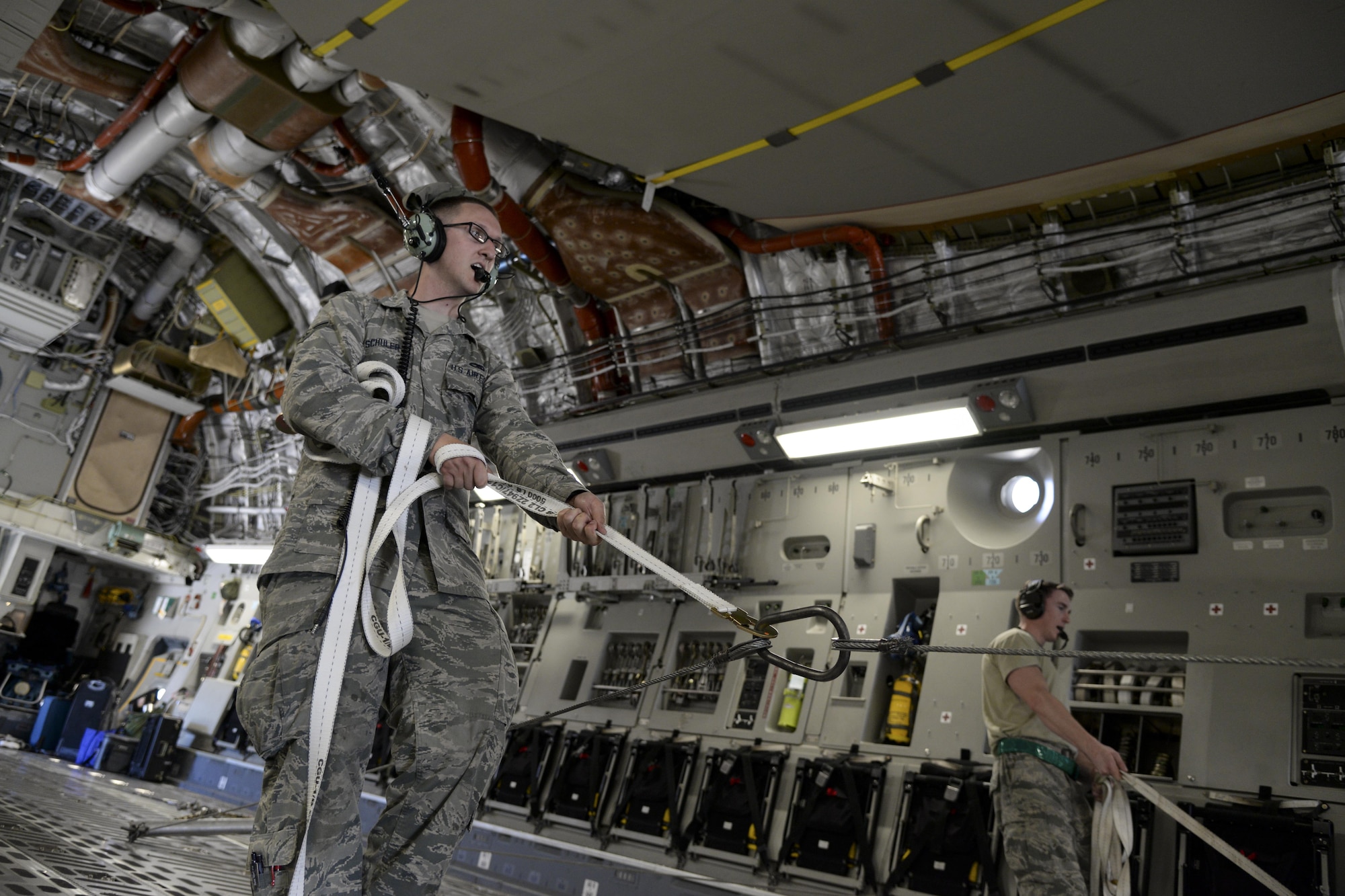 A C-17 Globemaster III, from Dover Air Force Base, Del., sits on the flightline as an HH-60G Pave Hawk helicopter is offloaded May 16, 2017, at Joint Base Langley-Eustis, Va. The C-17 transported two helicopters and 40 Airmen from Moody AFB, Ga., to JB Langley-Eustis where they participated in exercise Rapid Rescue RAPID RESCUE. (U.S. Air Force photo/Senior Airman Aaron J. Jenne)