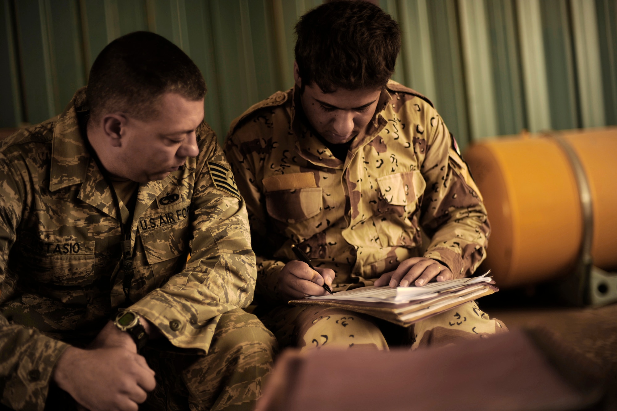 Tech. Sgt. Andrea Walton assists an Iraqi air force maintenance student using specialized tools to find microscopic cracks and flaws in aircraft parts during a training visit to the Army's NDI backshop July 13 at Taji Air Base, Iraq. Sergeant Walton is a nondestructive inspection instructor with the 721st Air Expeditionary Advisory Squadron. (U.S. Air Force photo/Staff Sgt. Michael B. Keller)