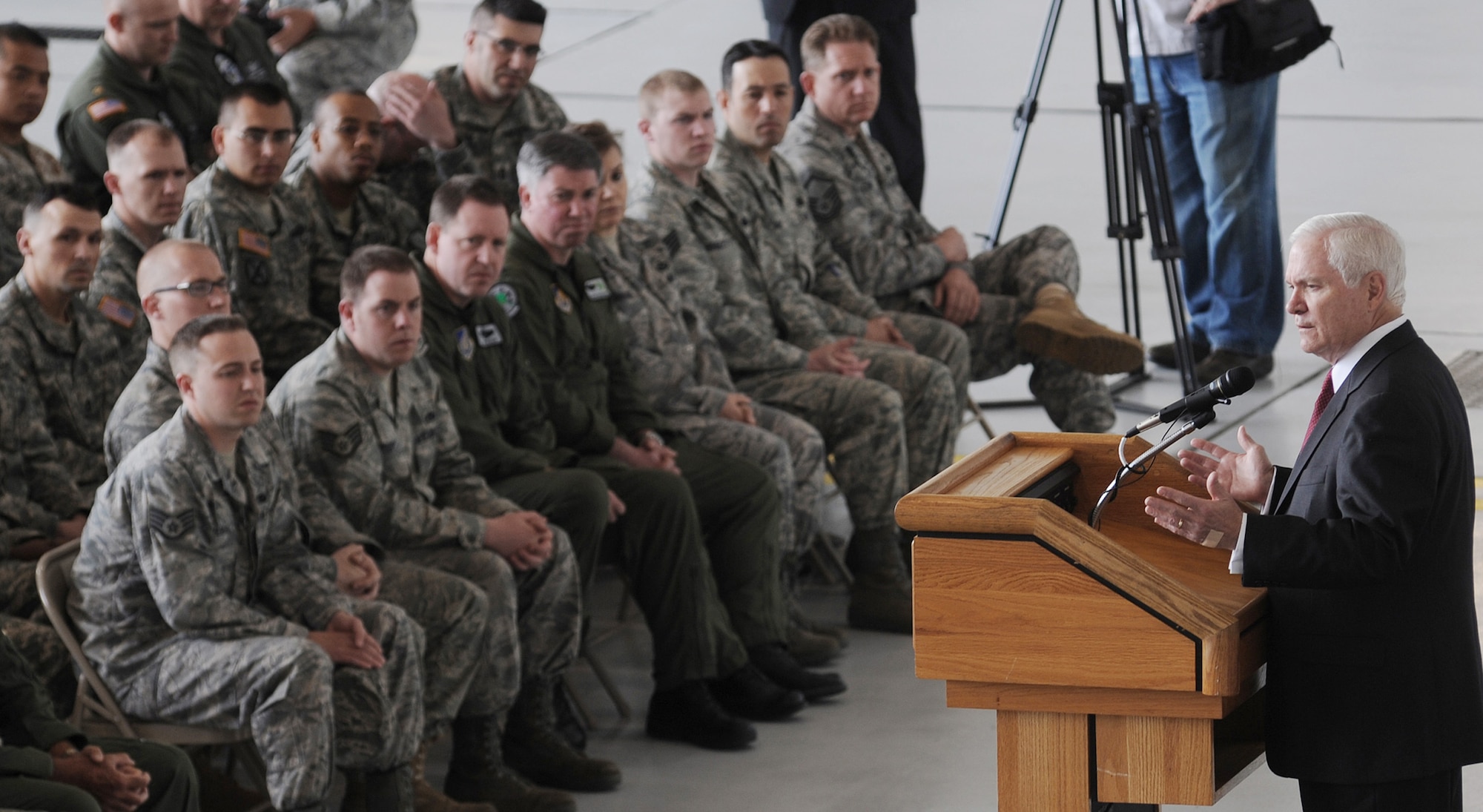 Secretary of Defense Robert M. Gates speaks to military servicemembers during a June 1 town hall meeting at Elmendorf Air Force Base, Alaska. Secretary Gates stopped at Elmendorf AFB enroute to Fort Greely, Alaska, to tour the Missile Defense Agency facilities there. (U.S. Air Force photo/Airman 1st Class Kristin High)