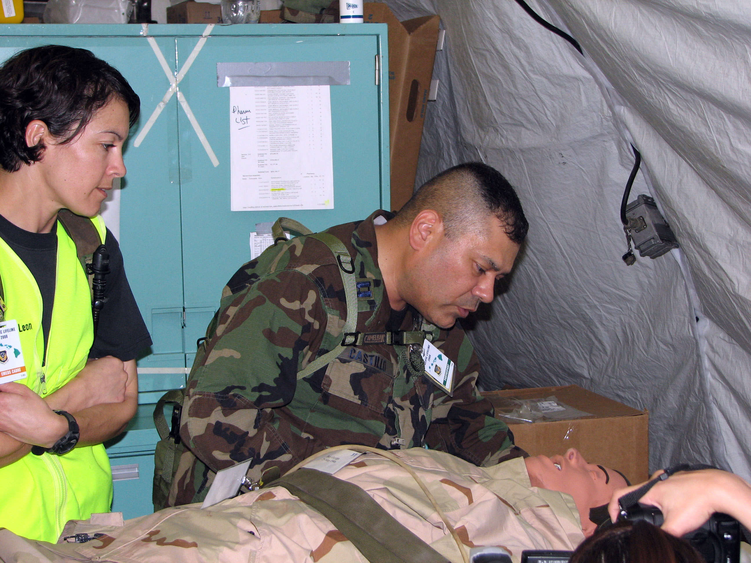 Senior Airman Nicole McCants checks the vital signs of a patient during a mass casualty exercise Feb. 4 at the Kona International Airport at Kona, Hawaii. Airman McCants, a respiratory therapy specialist from the 3rd Medical Group from Elmendorf Air Force Base, Alaska, is one of more than 900 Department of Defense members who participated in Pacific Lifeline, a total force humanitarian assistance and disaster relief exercise that took place from three locations within the Hawaiian Islands through Feb. 9. Led by 13th Air Force, Pacific Lifeline provided an integrated team of Air Force and Army active-duty, Air National Guard and Reserve component forces a training environment to test their abilities to respond to and support humanitarian and natural disaster relief operations. (U.S. Air Force photo/Senior Master Sgt. Charles Ramey)