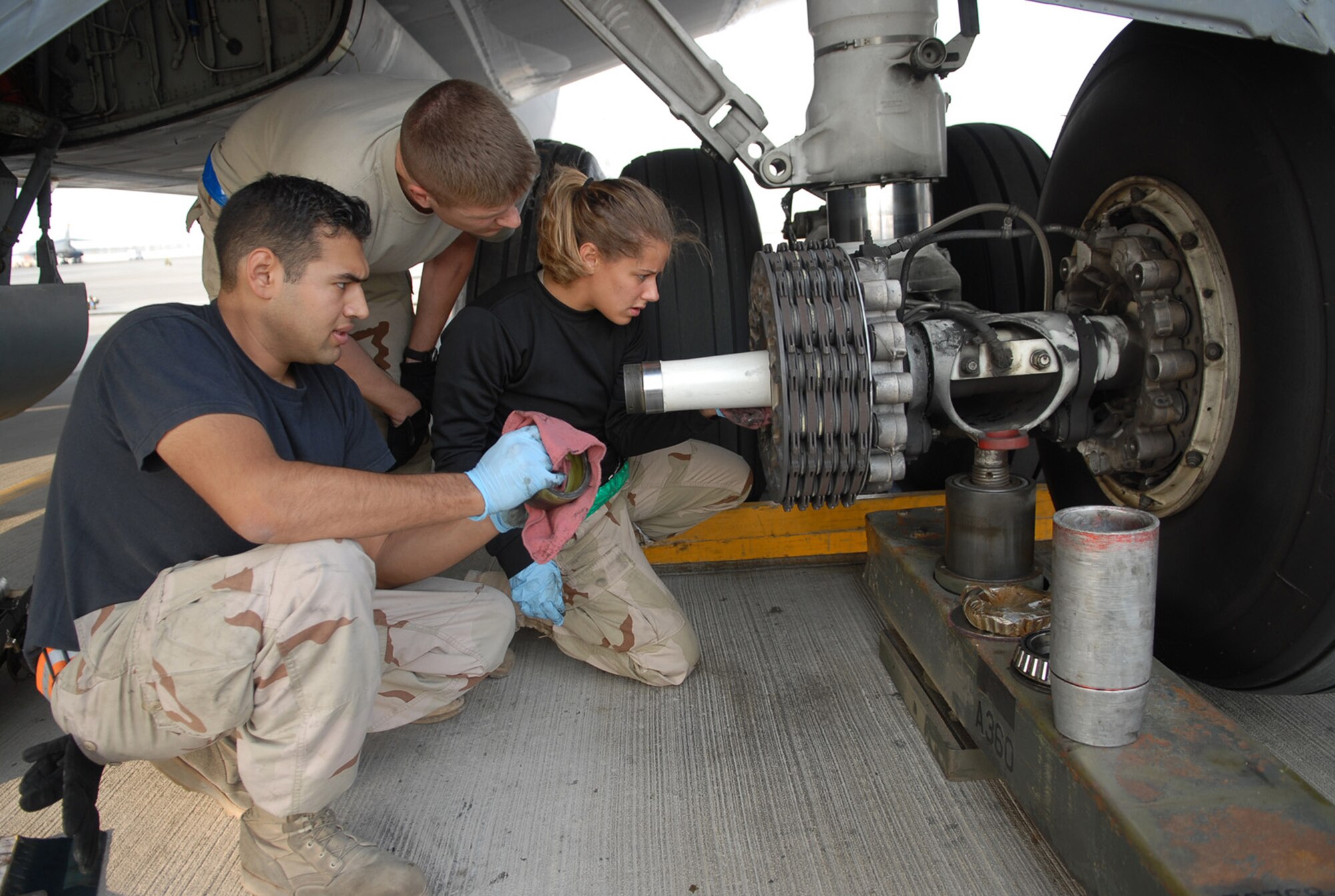 Staff Sgt. Ruben Mariscal, (from left) Staff Sgt. Frank Veres and Airman 1st Class Abigail Smith prepare to install a new wheel on a KC-135
