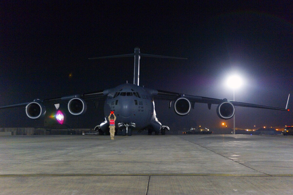 Airman 1st Class Grant Phillips marshals out a brand new mine resistant ambush protected vehicle to the flightline Dec. 8 at Balad Air Base, Iraq. Driving the MRAP is Senior Airman Christine Mirgon, a member of the aerial port team who set a new record for most cargo movement in a day Dec. 6. Airman Phillips is a C-17 Globemaster III loadmaster deployed from Charleston Air Force Base, S.C., and Airman Mirgon is a 332nd Expeditionary Logistics Readiness Squadron aerial porter deployed from Offut Air Force Base, Neb. (U.S. Air Force photo/Staff Sgt. Travis Edwards)