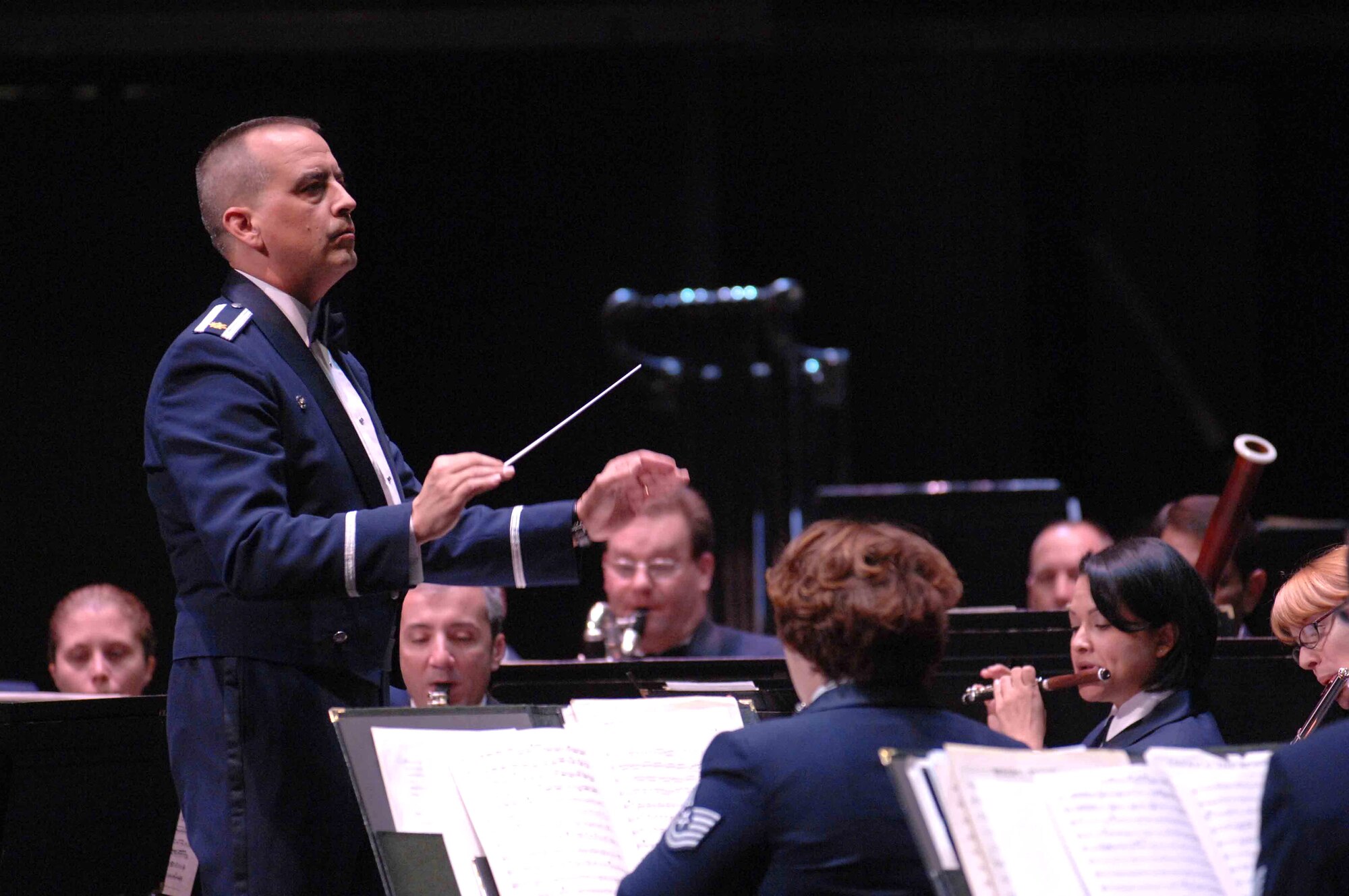 Maj. Richard Mench conducts the musical piece "Overture to Nabucco" during an Oct. 17 performance at the University of Nevada Las Vegas. Major Mench is commander of the Air Force Band of the Golden West. The Band of the Golden West, from Travis Air Force Base, Calif., is the only active duty Air Force band west of the Rocky Mountains. They are scheduled to perform five free concerts in the Las Vegas community. The band supports 10 active duty Air Force bases, five Air Force Reserve wings and five recruiting squadrons in California, Washington, Oregon, Idaho and Nevada with more than 500 annual performances. (U.S. Air Force photo/Senior Airman Larry E. Reid Jr.)