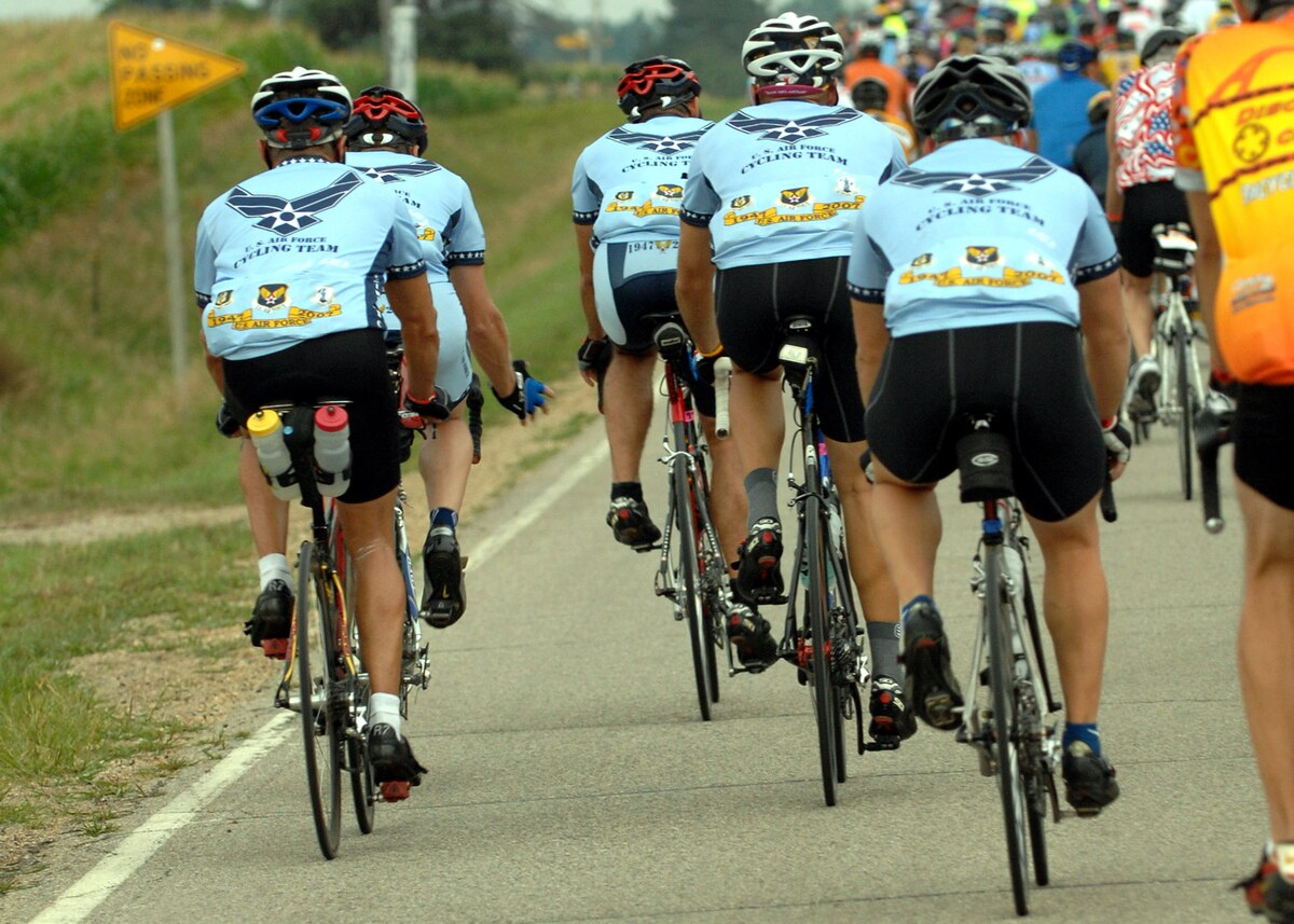 At dawn on July 21, 148 Air Force Cycling Team bicyclists kicked off a 477-mile bike ride across Iowa. Sponsored by the Des Moines Register newspaper, the Register's Annual Great Bike Ride Across Iowa, or RAGBRAI, is the longest, largest and oldest ride in America with 10,000 riders from all over