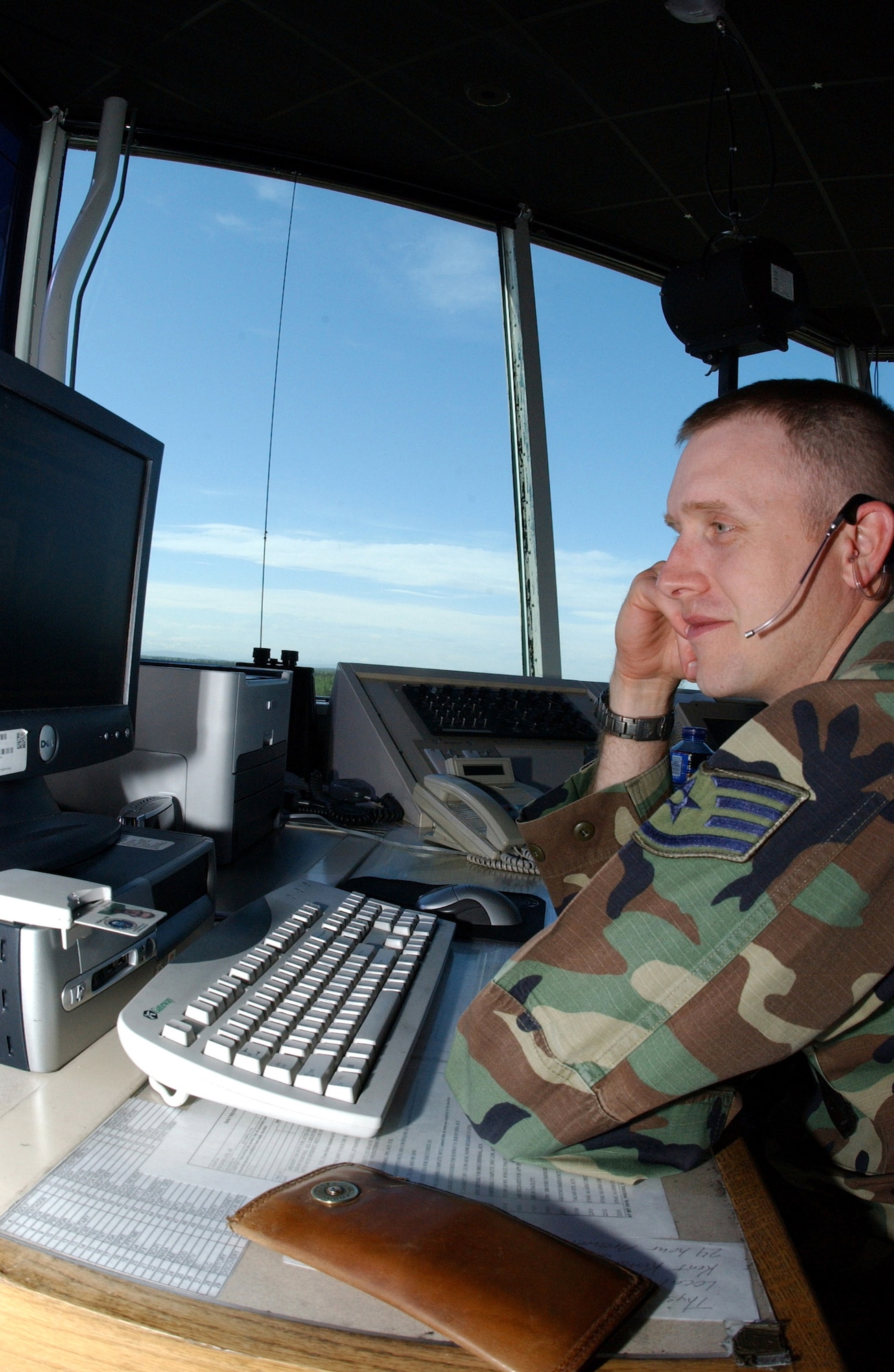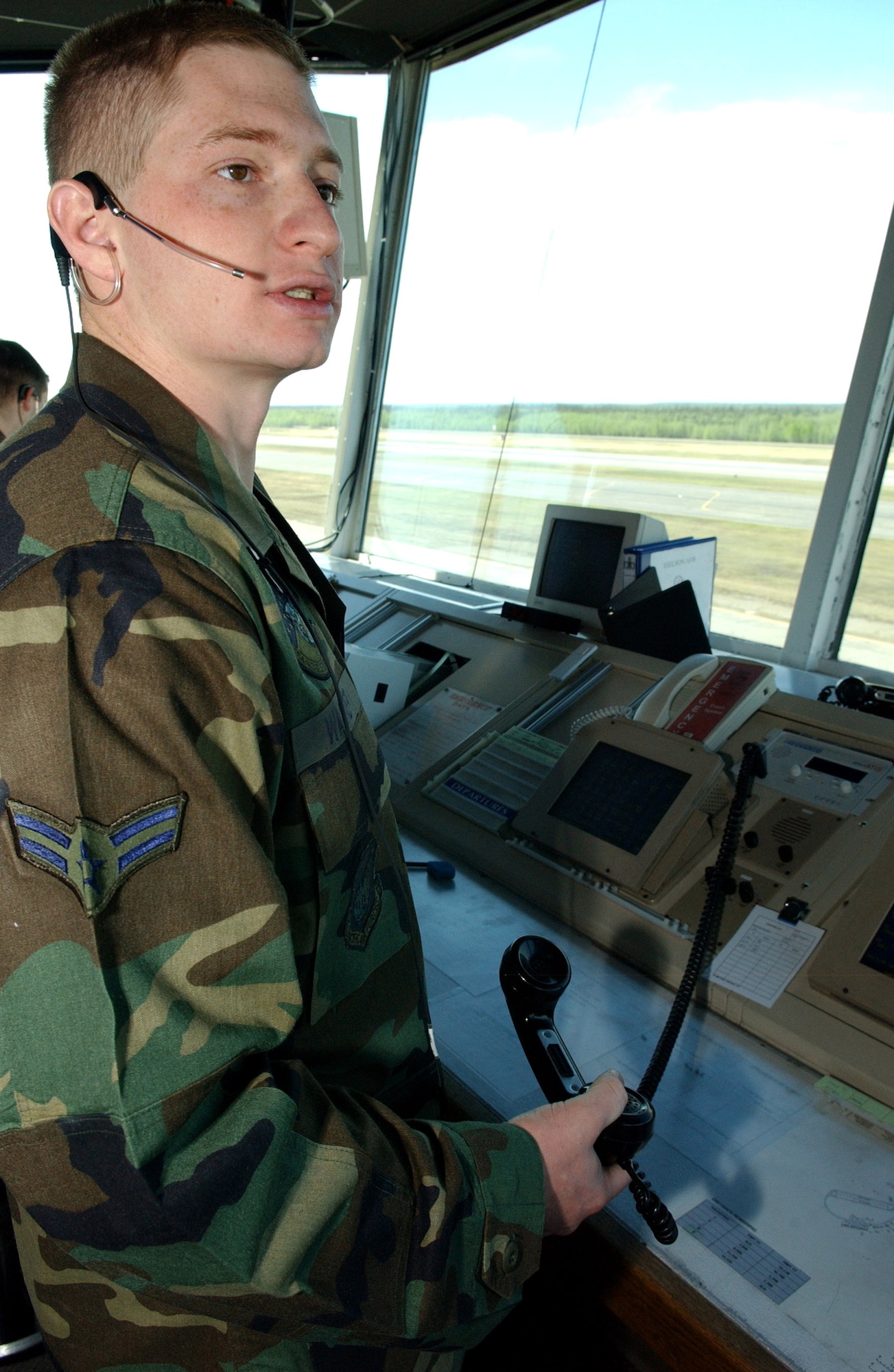 Airman 1st Class Kenneth Wagner, 354th Operations Support Squadron air traffic controller, releases a new Automatic Terminal Information Service to all pilots at Eielson Air Force Base, Alaska, May 23. The ATIS is information which includes the type of weather, wind direction and wind speed, and is updated every time conditions change. (U.S. Air Force photo/Airman 1st Class Christopher Griffin)