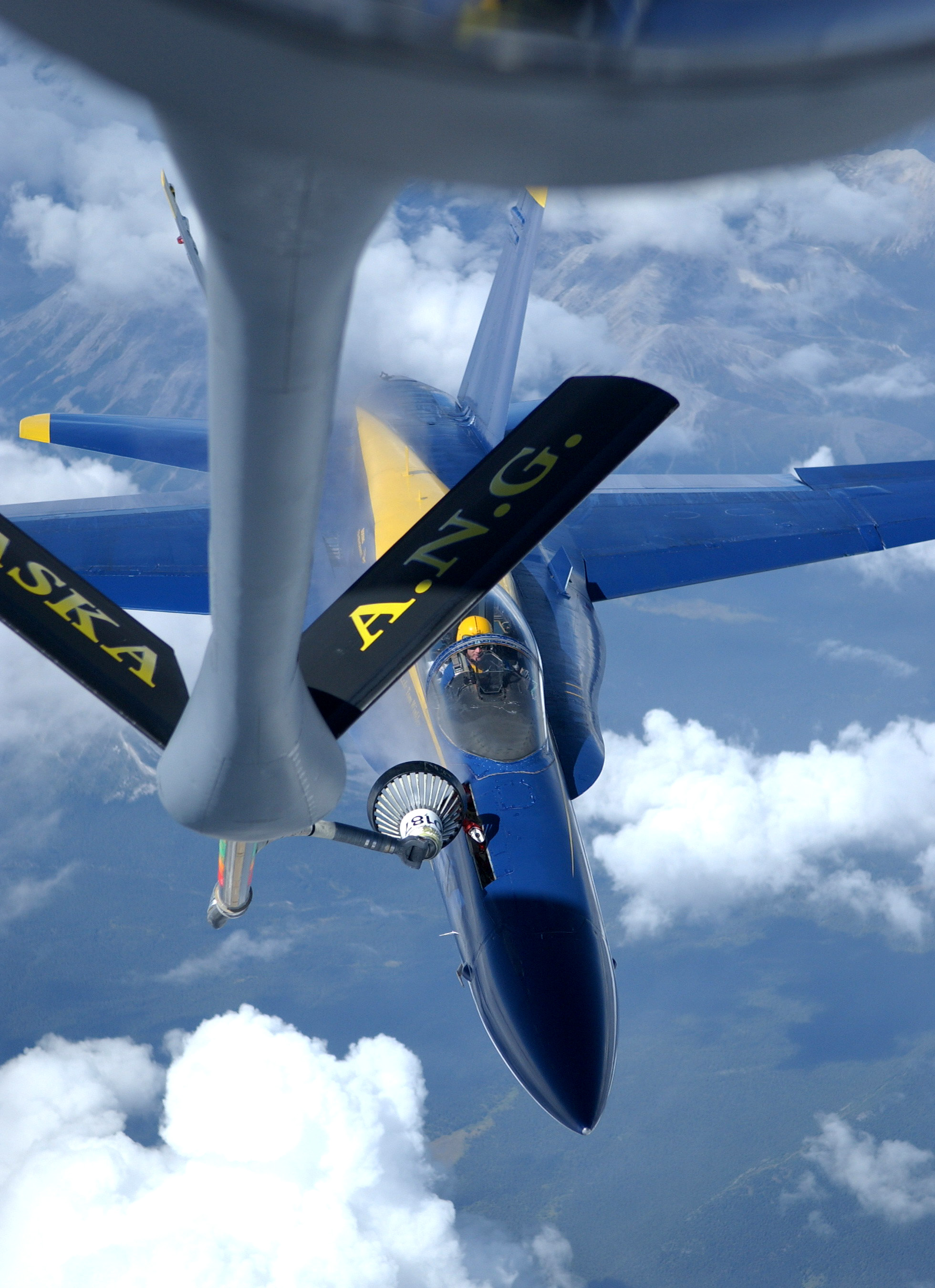 A KC-135 Stratotanker stands by to refuel a pair of F/A-18 Hornets from the Navy's Blue Angels on their way from an air show at Elmendorf Air Force Base, Alaska, on Aug. 14. The KC-135 is with the 168th Air Refueling Wing at Eielson AFB, Alaska. (U.S. Air Force photo/Senior Airman Anthony Nelson Jr.)
