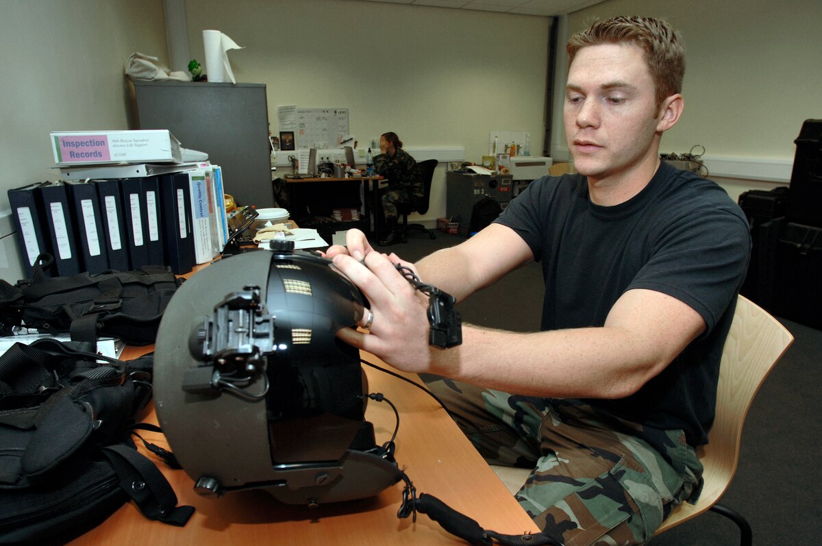 Airman 1st Class Matt Maurer inspects the main rotor of an HH-60 Pave Hawk helicopter at Royal Air Force Lakenheath, England, on Aug. 2. The Airman is with the 56th Aircraft Maintenance Unit. The unit supports the 56th Rescue Squadron, which moved to this fighter base from Keflavik Air Base, Iceland, in May. (U.S. Air Force photo/Master Sgt. Lance Cheung)