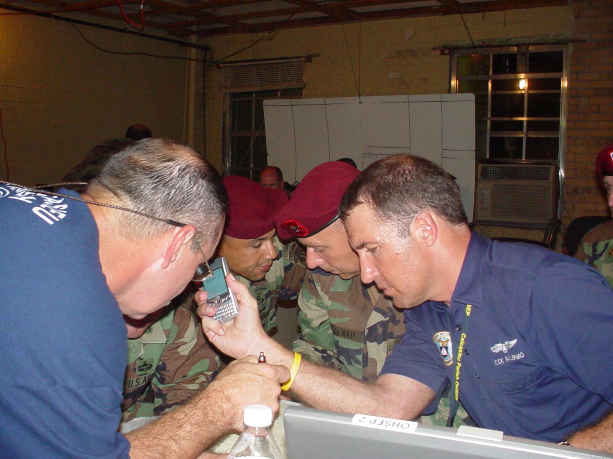 Civil Air Patrol Col. Rock Palermo discusses Hurricane Rita relief operations in Lake Charles, La., with Chuck Kleckley, Louisiana state representative; Hal McMillin, Calcasieu Parish police jury president; Ronnie Johns, Louisiana state representative; and David Vitter, U.S. senator from Louisiana. Colonel Palermo spent nearly three weeks directing local emergency operations in his hometown of Lake Charles. He was drafted as operations section chief and later deputy director because of his past disaster management experience. (U.S. Air Force photo/Tom R. Malmay Jr.)