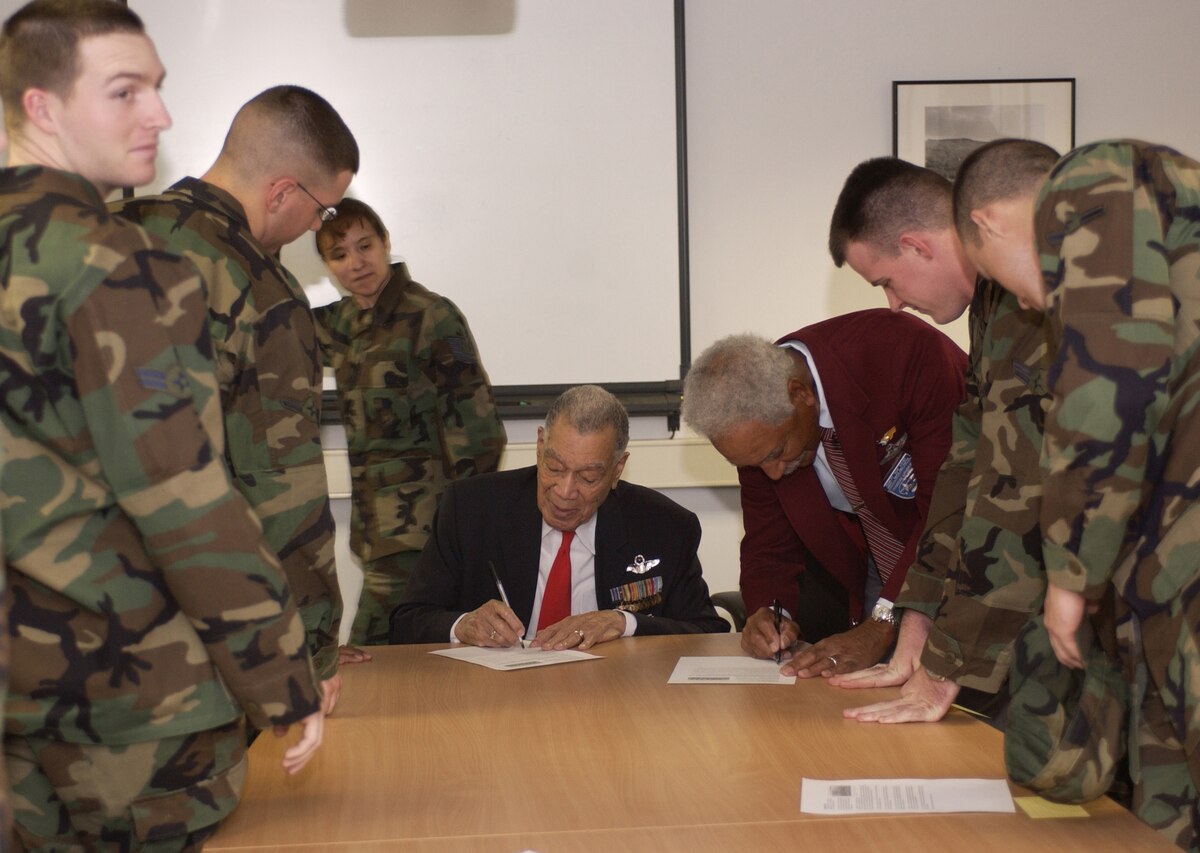 SPANGDAHLEM AIR BASE, Germany (AFPN) -- Retired Lieutenant Colonels (right to left) Lee Archer, Robert Ashby and Asa Herring, members of the original Tuskegee Airmen, visit the 52nd Aircraft Maintenance Squadron. The Tuskegee Airmen visited the base Feb. 21 as part of the celebration of African-American History Month. (U.S. Air Force photo by Senior Airman Kristin Ruleau)