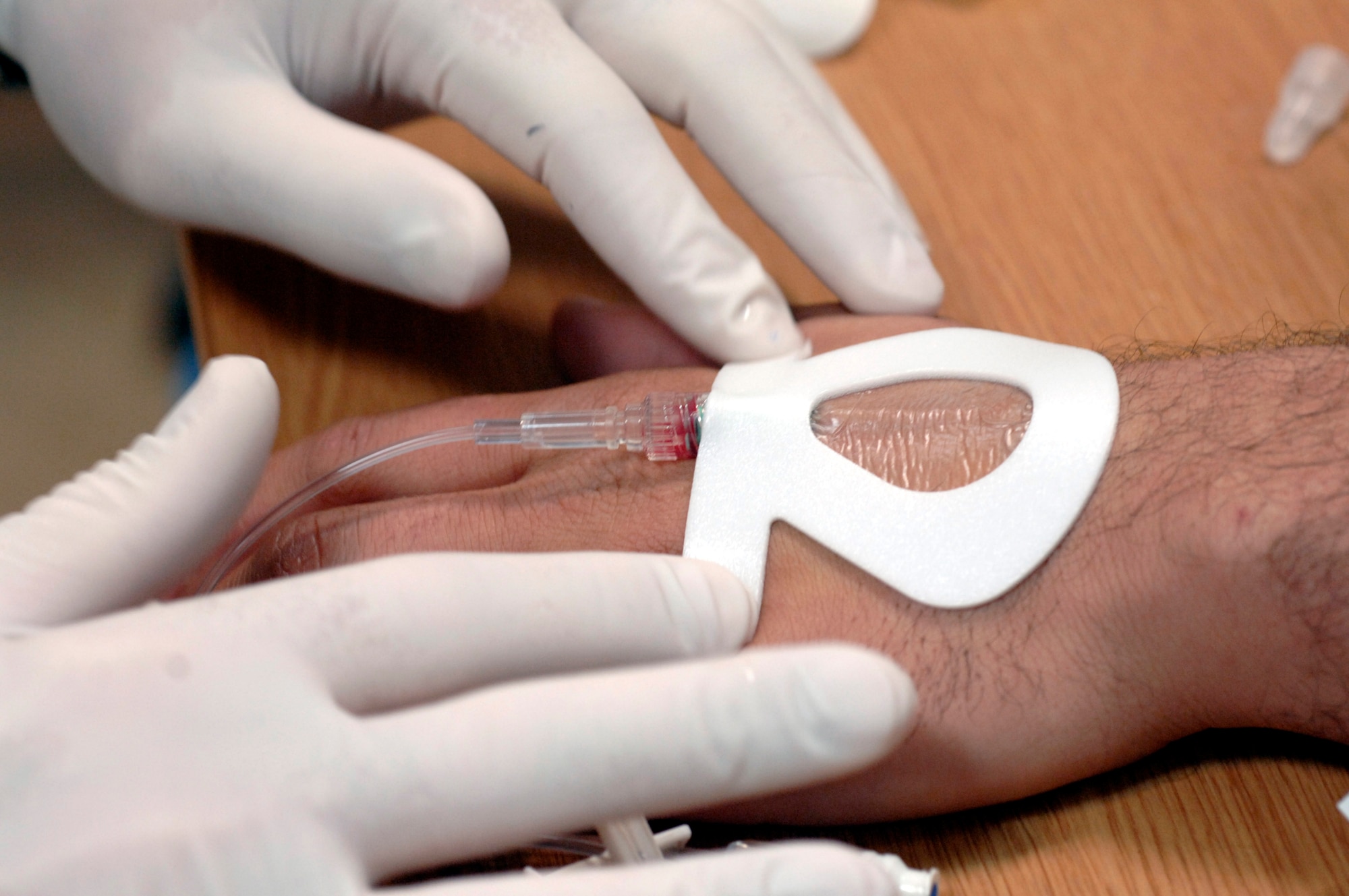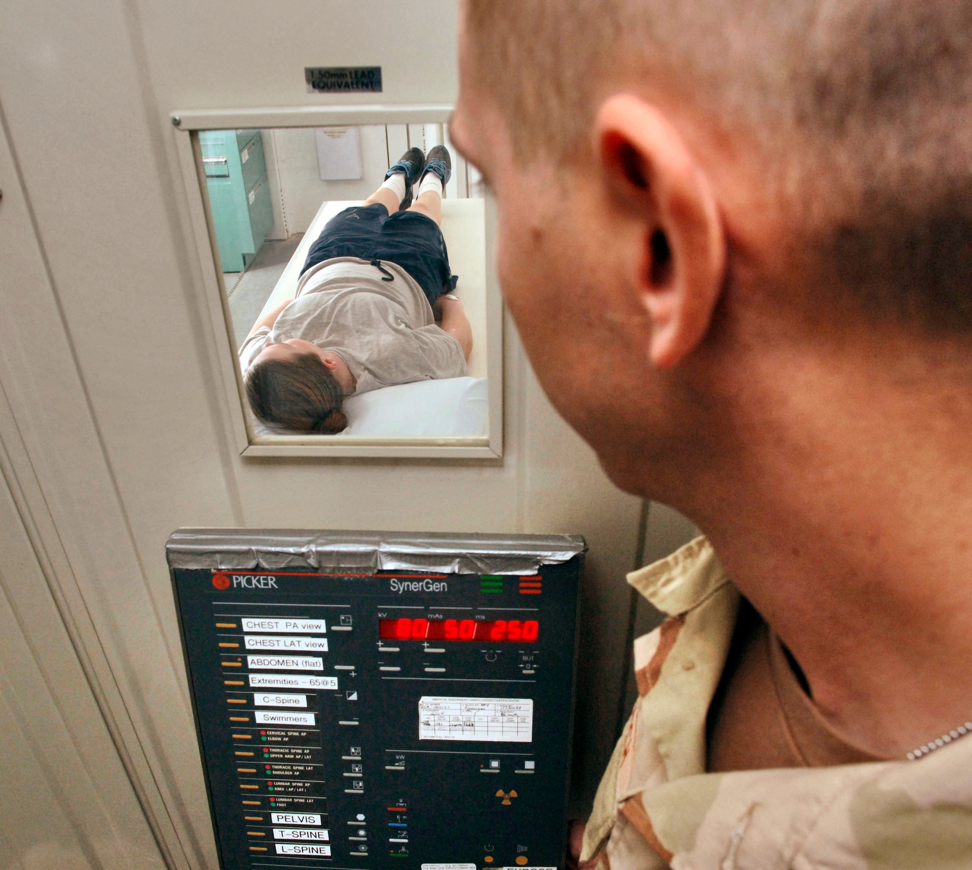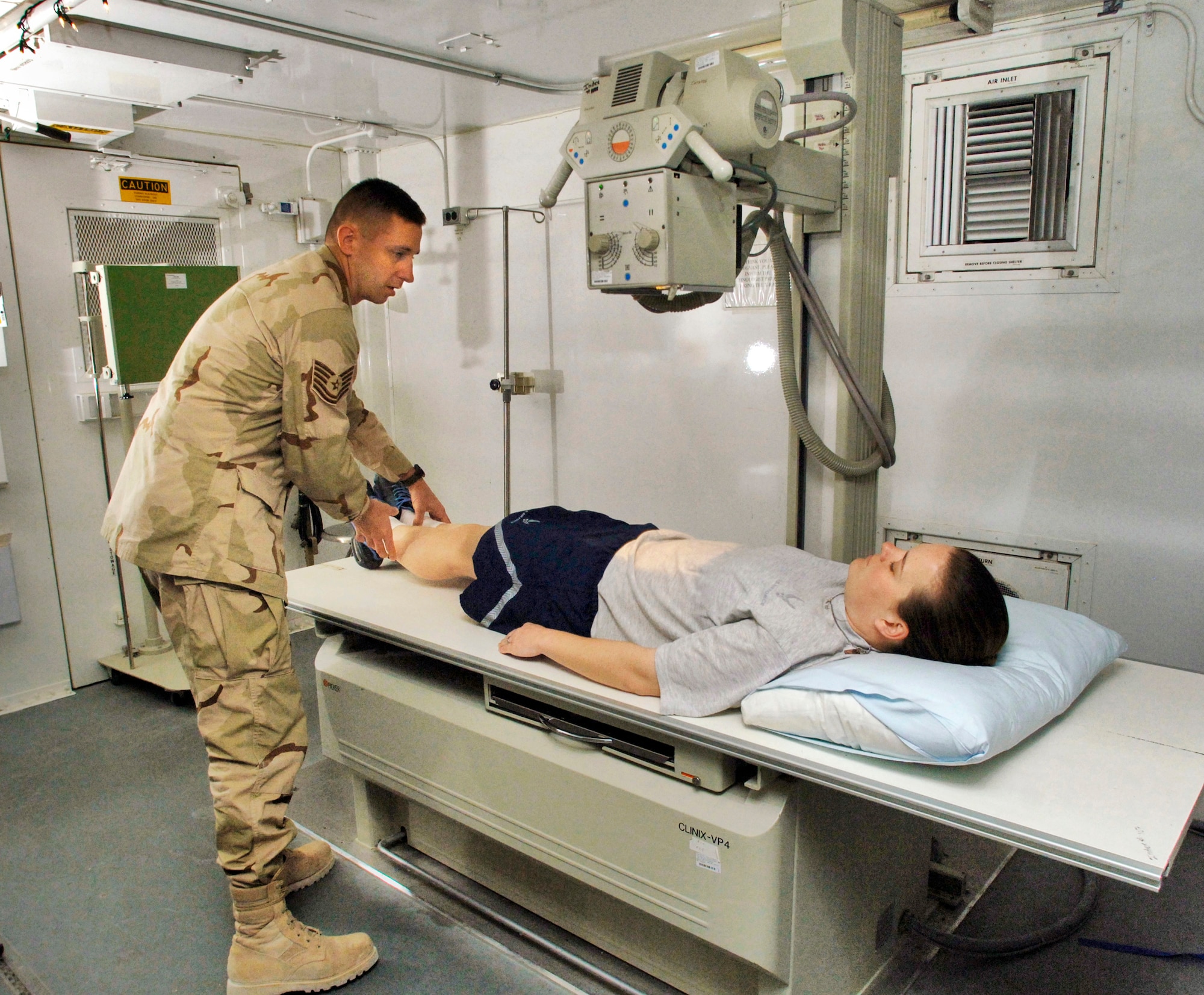 SOUTHWEST ASIA (AFPN) -- Tech. Sgt. Joel Hermesch prepares Airman Renee Wyatt for an X-ray at the 379th Expeditionary Medical Group. The expeditionary medical support unit, with its 10 beds, provides medical care of forward deployed personnel while still in theater. Sergeant Hermesch is a diagnostic imaging craftsman from David Grant Medical Center at Travis Air Force Base, Calif. (U.S. Air Force photo by Master Sgt. Lance Cheung)