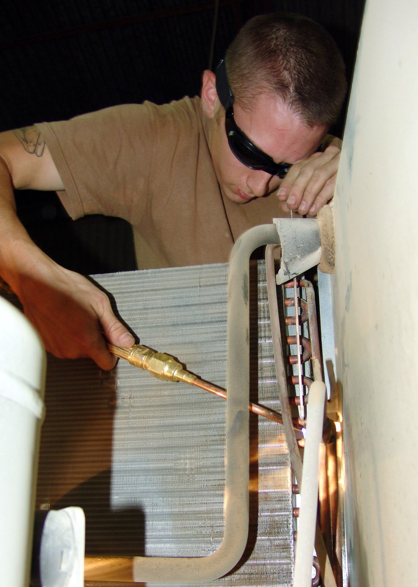 KIRKUK AIR BASE, Iraq - Airman 1st Class Jason Klingman repairs a leak in an air conditioning unit. The heating ventilation and air conditioning Airmen here keep a cool breeze blowing on Airmen and equipment during Iraqi summers with temperatures topping 120 degrees. (U.S. Air Force photo by Tech. Sgt. J. LaVoie)
