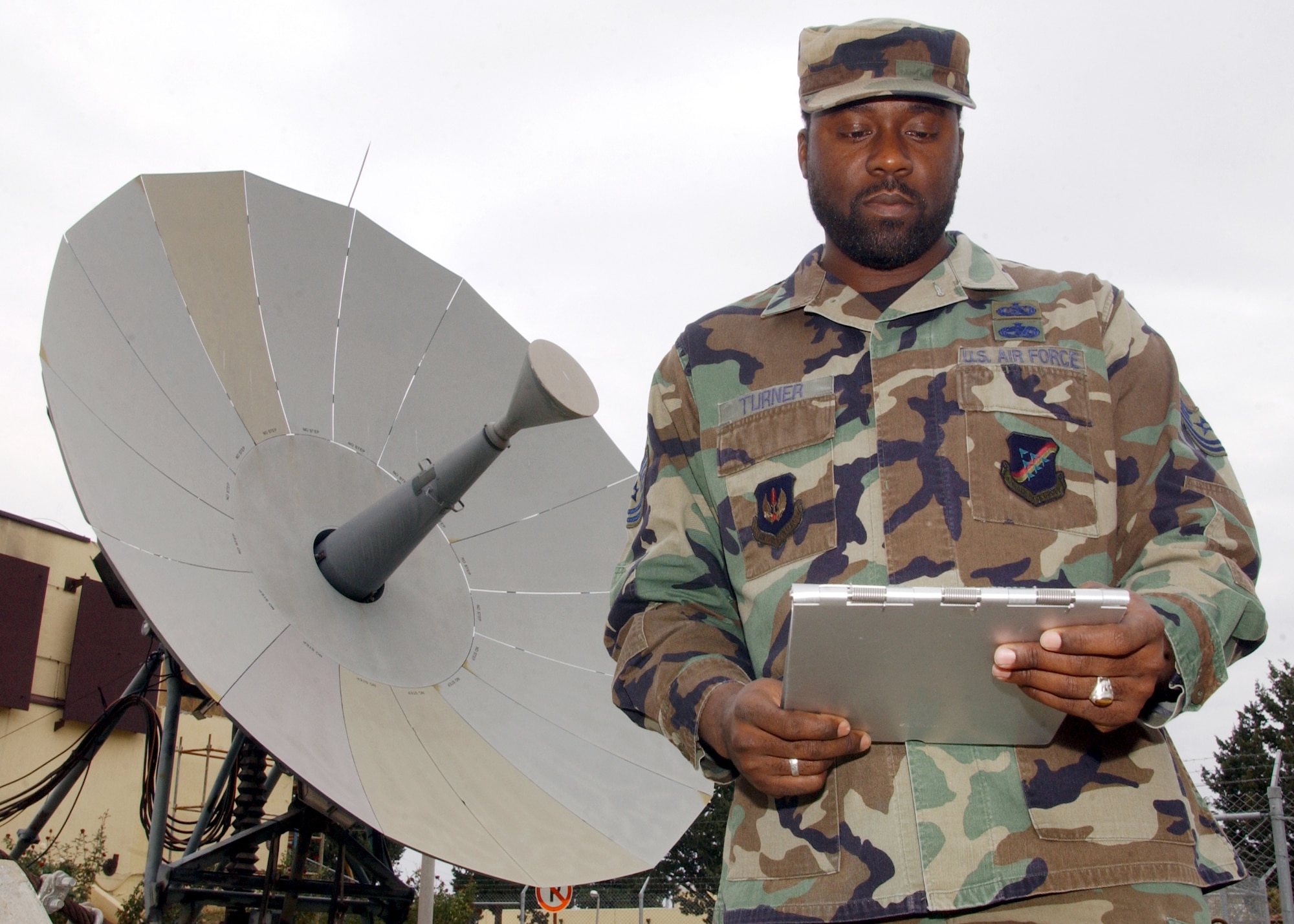 INCIRLIK AIR BASE, Turkey -- Tech. Sgt. Glynis Turner inspects satellite communication equipment here. During his free time, he is the Islamic lay leader for the base chapel which welcomes all religions. Turner is a quality assurance evaluator with the 39th Communications Squadron. (U.S. Air Force photo by Airman 1st Class Joseph Thompson)