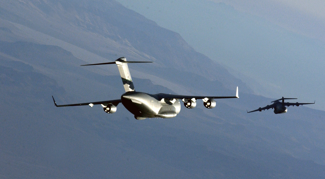 NELLIS AIR FORCE BASE, Nev. -- Two C-17 Globemaster III aircrews prepare for a simulated air drop Dec. 10 during a two-week mission-employment exercise here. The exercise brought students from the Air Force, Navy and German air force together to learn how their aircraft can integrate during realistic combat scenarios. This is the first year a C-17 has been included in the exercise. (U.S. Air Force photo by Tech. Sgt. Kevin Gruenwald)
