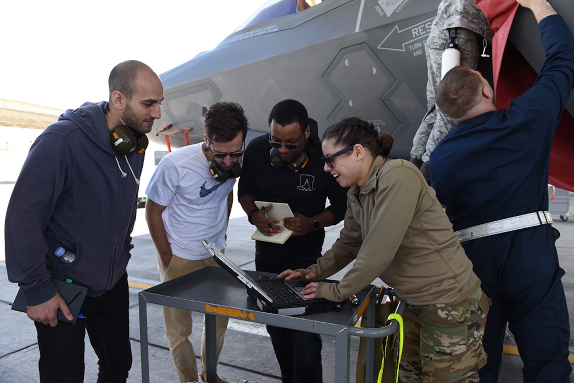 Ron Golan, Peter Wallace and DeMarcus Townsend from Detachment 12 at Hanscom Air Force Base, Mass., work with Staff Sgt. Samantha Buxton, dedicated crew chief with the 57th Wing’s Bolt Aircraft Maintenance Unit at Nellis Air Force Base, Nev., on the Nellis AFB flight line, near an F-35 Lightning II Joint Strike Fighter April 10, 2019. The “Mad Hatter” team from Det. 12 is learning how maintainers navigate technical orders while working on the flight line. (U.S. Air Force photo by Airman 1st Class Bailee Darbaise)