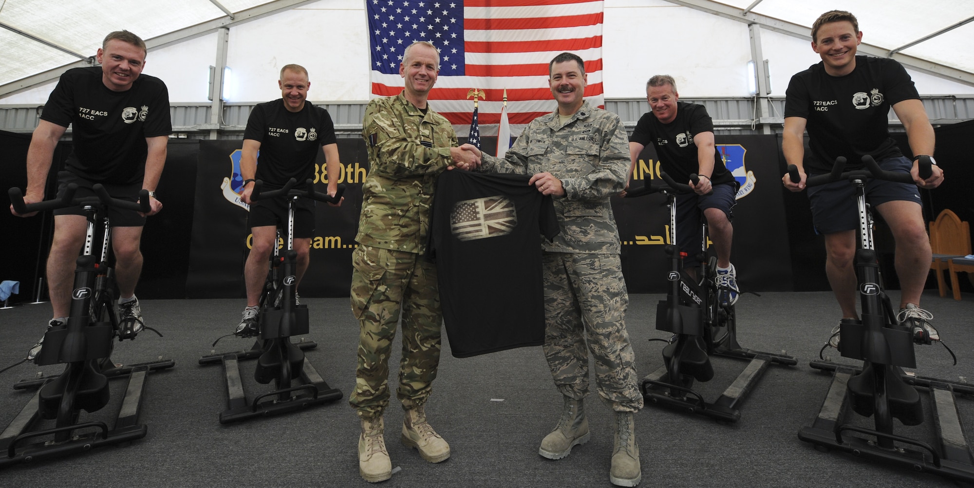 Royal Air Force Group Capt. Paul Atkinson, middle, Air Surveillance and Control System Force Commander shakes hands with Lt. Col. Berry McCormick, 727th Expeditionary Air Control Squadron commander at an undisclosed location in Southwest Asia June 27, 2013. The team of four Royal air force members, in the background, set out to exercise their way back to Lincoln, England, roughly 3,400 miles away, in honor of RAF and U.S. Air Force members who have been injured or killed in contingency operations overseas. They inspired the 727th EACS to start their own effort to honor a member back in the U.S. (U.S. Air Force photo/Senior Airman Jacob Morgan)