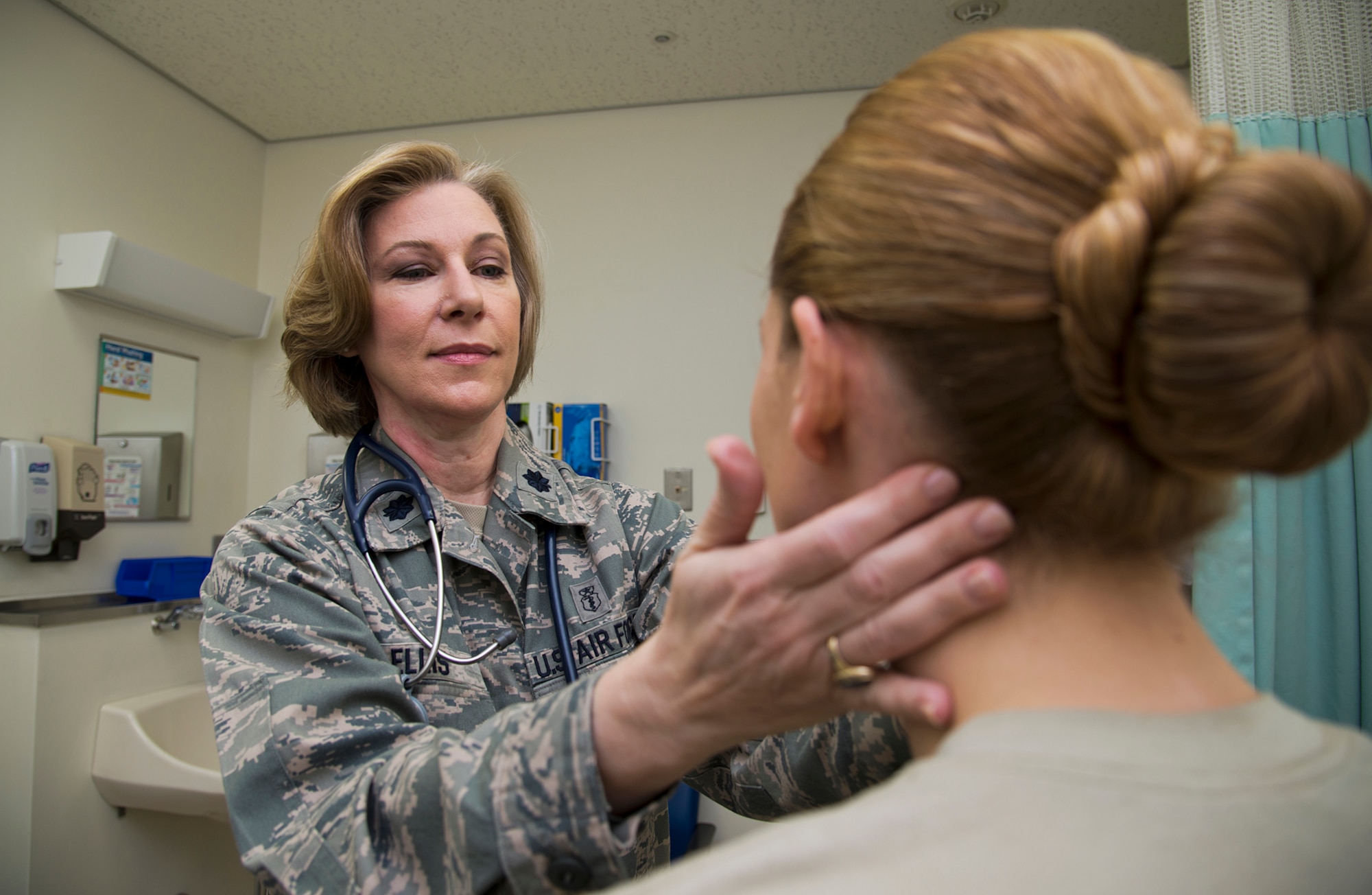 Lt. Col. Melanie Ellis examines a patient Mar. 14, 2014, at Misawa Air Base, Japan. Ellis is being recognized for her mentorship, experience and countless accomplishments in her 20-year career as a physician assistant. She is the 35th Medical Operations Squadron commander. (U.S. Air Force photo/Tech. Sgt. Araceli Alarcon)