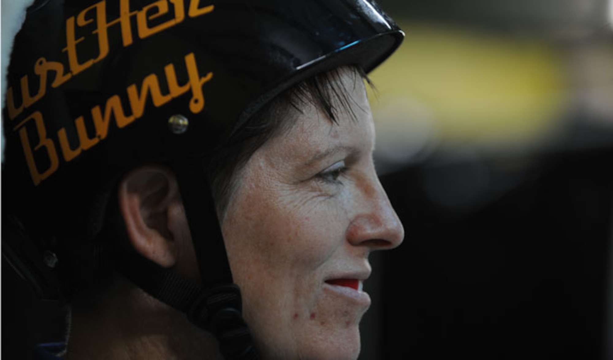 Lt. Col. Melanie Friedman looks at the skating rink Aug. 9, 2014, moments before the Capitol City Rollin’ Rebels and Mobile Derby Darlins’ roller derby bout in Montgomery, Ala. Friedman is the deputy director of intelligence at the Curtis E. Lemay Center for Doctrine, Development and Education at Maxwell Air Force Base, Ala. (U.S. Air Force photo/Staff Sgt. Natasha Stannard)