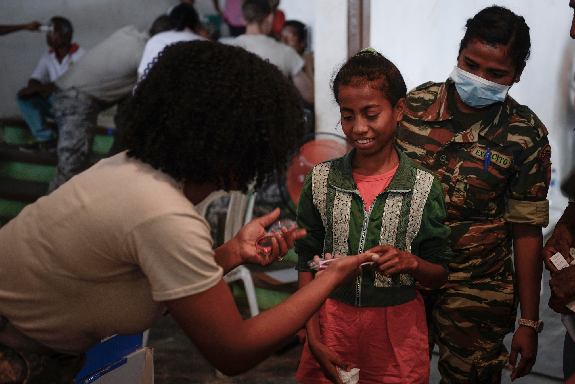 Maj. Richard Trowbridge (right), a family practice physician assigned to the 374th Medical Group at Yokota Air Base, Japan, extracts a cyst from a patient's arm with Defence Forces of Timor-Leste 2nd Lt. Anabela de Cruz (left), during an Operation Pacific Angel 15-2 health services outreach clinic Sept. 7, 2015, in Baucau, Timor-Leste. PACANGEL is a multilateral humanitarian assistance civil military operation, which improves military-to-military partnerships in the Pacific while also providing medical health outreach, civic engineering projects and subject matter exchanges among partner forces. (U.S. Air Force photo/Staff Sgt. Alexander W. Riedel)
