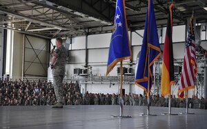 An American flag, the symbol of freedom, served as the backdrop in a vast aircraft hangar. The bleachers were filled to the brim with Airmen, families and well-wishers from all around the Air Force who came to bid farewell to the 17th Chief Master Sgt. of the Air Force James A. Cody and welcome the