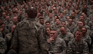 Airmen arrived early to fill the base auditorium seats at Peterson Air Force Base, Colorado, for an all call with Chief Master Sgt. of the Air Force Kaleth O. Wright, March 6, 2018.