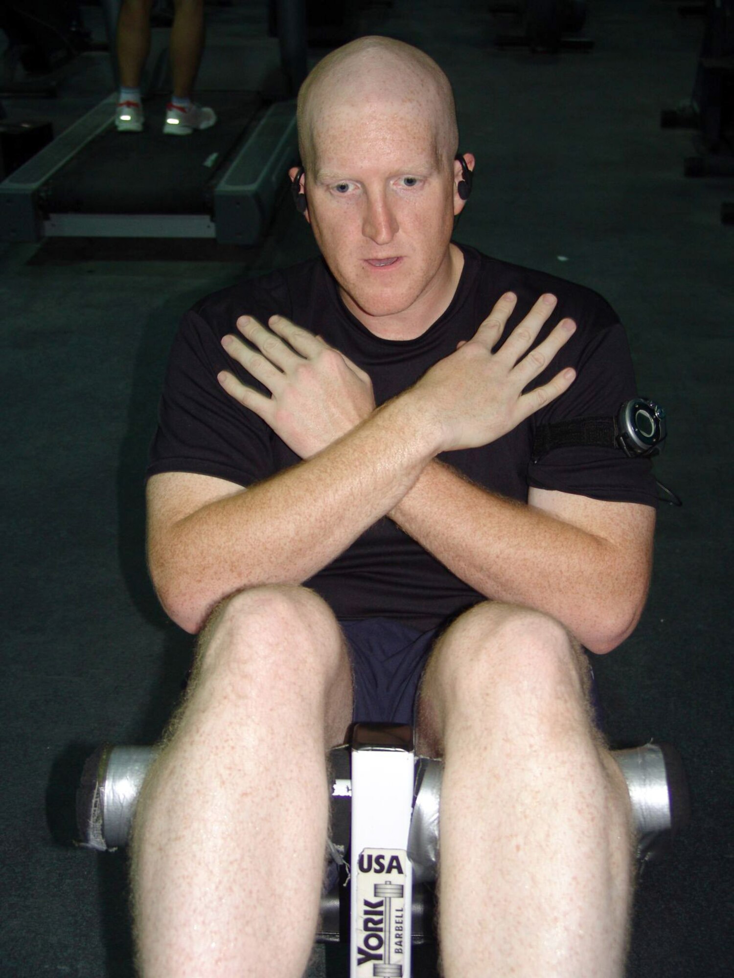SOUTHWEST ASIA -- Staff Sgt. Dan Foster performs a set of incline sit-ups at the fitness center at a forward-deployed location Aug. 26. Sergeant Foster performs at least 100 sit-ups every day as part of his new physical fitness routine. Since June 7, he has lost 53 pounds by altering his eating habits and adhering to a strict exercise regimen. He is assigned to the 386th Expeditionary Communications Squadron and is deployed from Little Rock Air Force Base, Ark. (U.S. Air Force photo by Staff Sgt. Carlos Diaz)