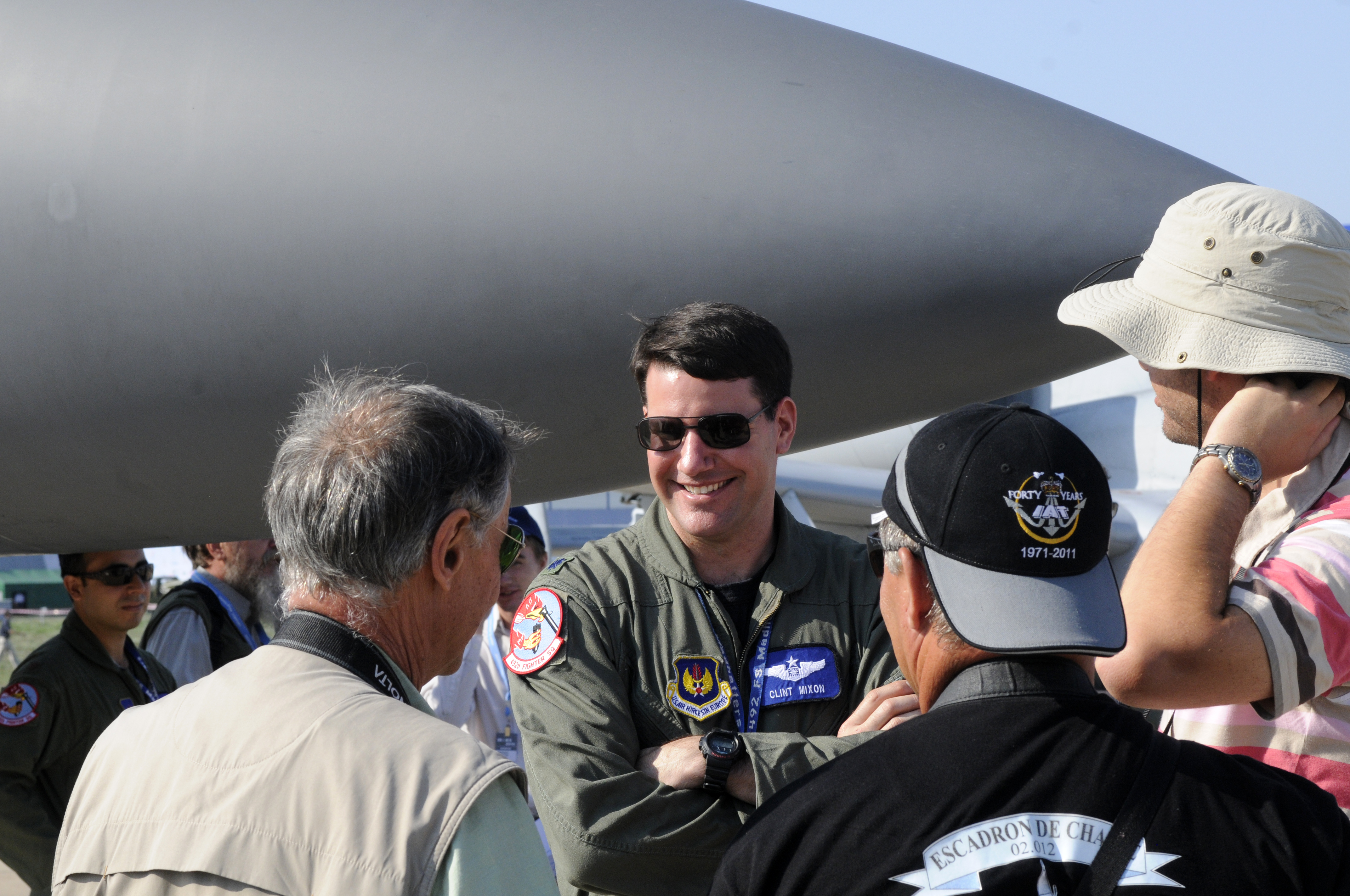 Lt. Col. Clint Mixon, a weapon systems officer from the 492nd Fighter Squadron at Royal Air Force Lakenheath, England, explains the capabilities of the F-15E Strike Eagle on display Aug. 16, 2011, at the Moscow International Aviation and Space Salon, or MAKS, at Zhukovsky Airfield. MAKS is one of the premier events of its type in the world and Department of Defense participation demonstrates the U.S. commitment to international security, promotes international cooperation and contributes to U.S. foreign policy objectives. (U.S. Air Force photo/Master Sgt. Kelley J. Stewart)