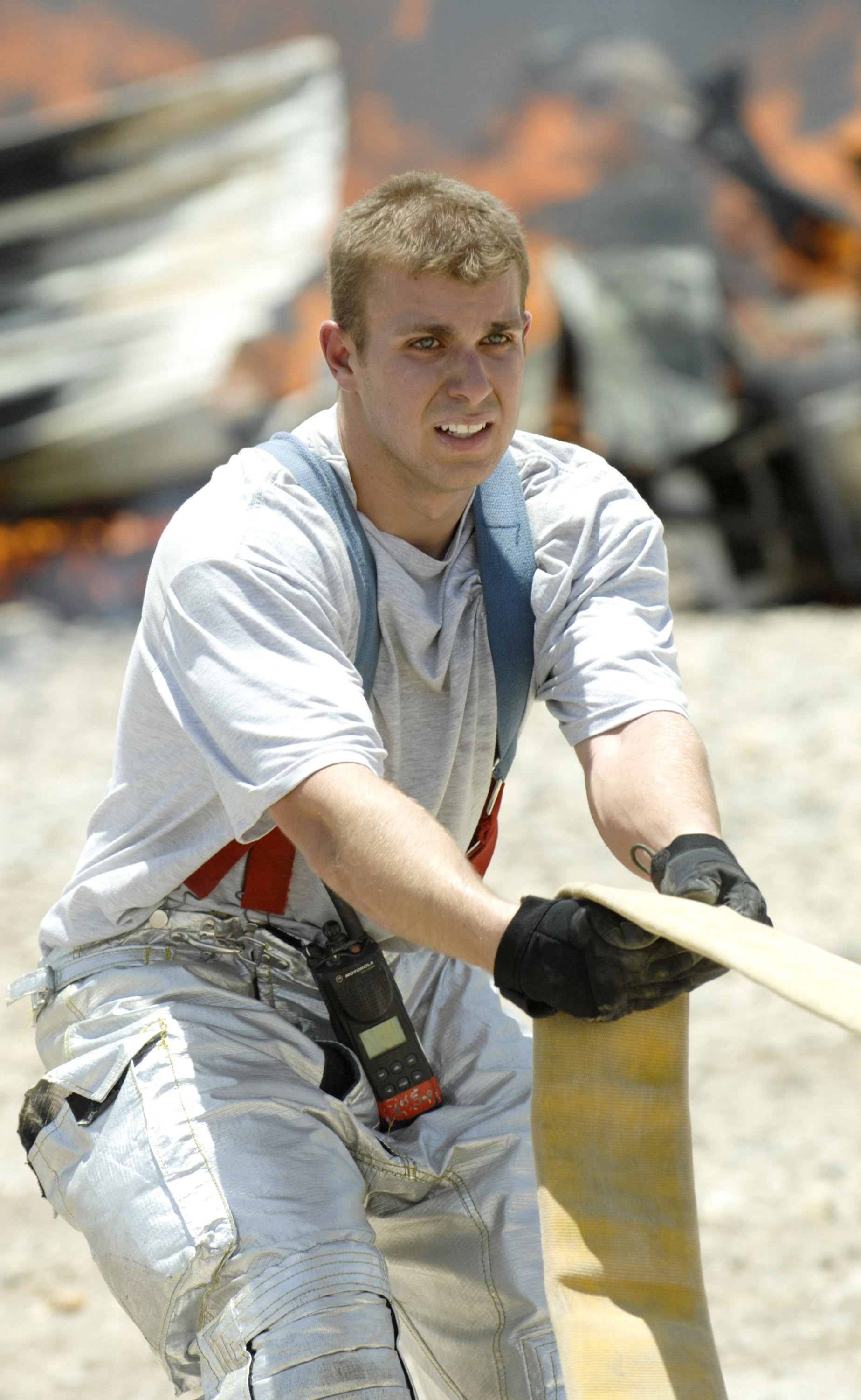 Airman 1st Class Brandon Smith stretches out a hose Jun 19 to assist fellow firefighters responding to a fire in Camp Adder, Iraq. Airman Smith is with the 407th Expeditionary Civil Engineer Squadron, Ali Air Base, Iraq, (U.S. Air Force photo/Master Sgt. Robert W. Valenca)