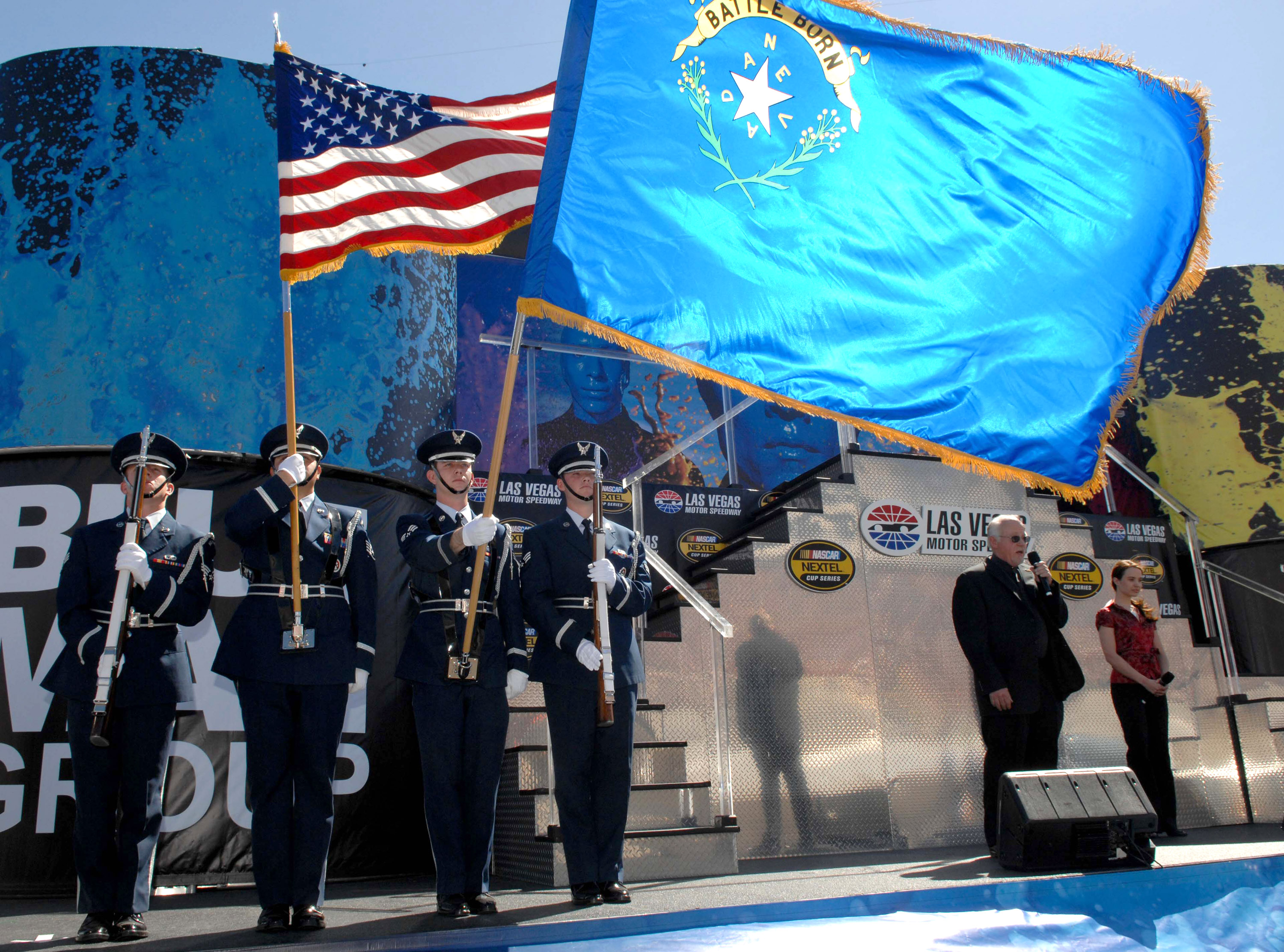 Air Force Honor Guard members from Nellis Air Force Base, Nev. present the colors March 11 during pre-race festivities prior to the start of the UAW Daimler-Chrysler 400 at the Las Vegas Motor Speedway. (U.S. Air Force photo/Master Sgt. Robert W. Valenca)