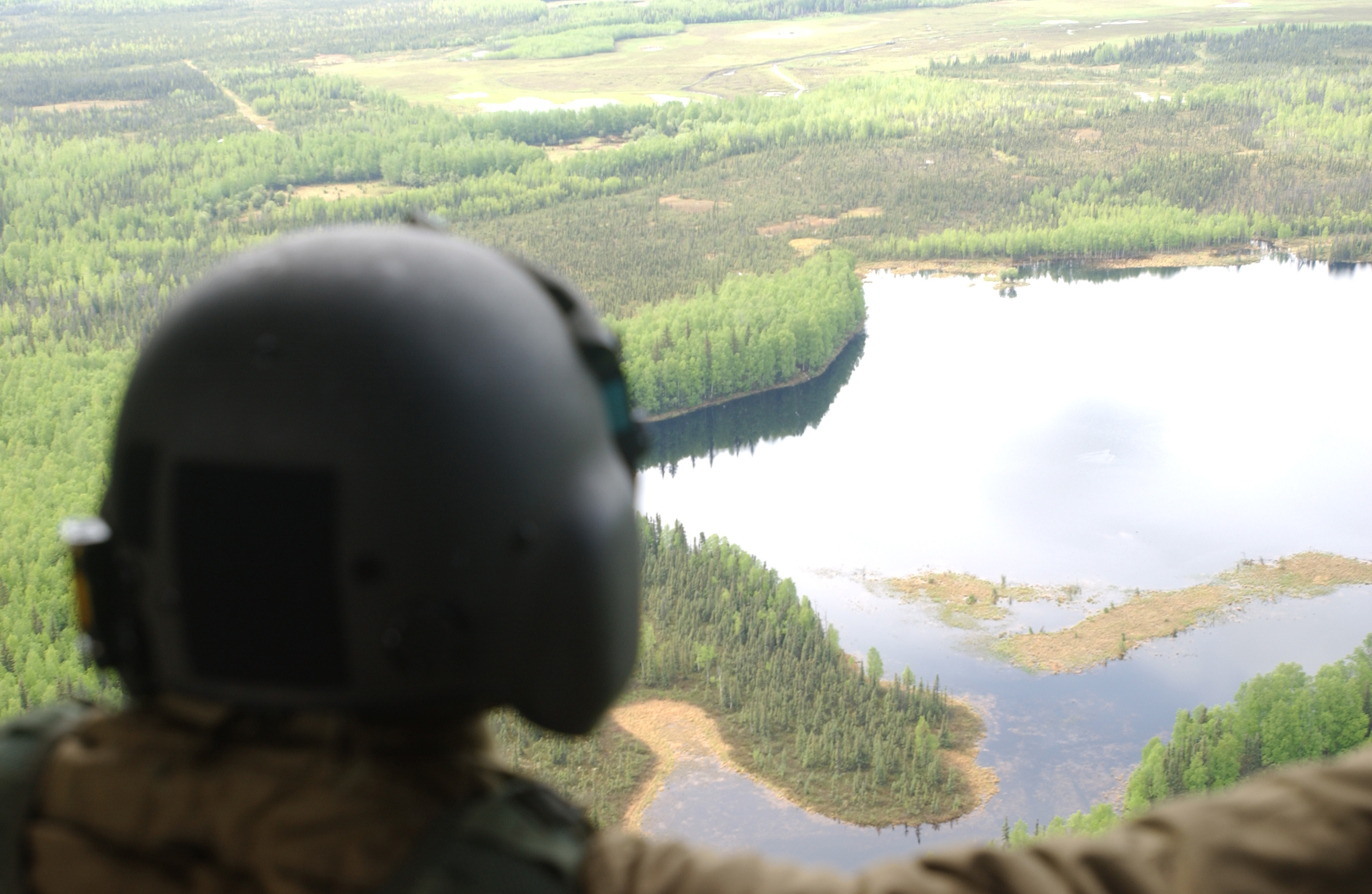 OVER ALASKA -- An Airman assigned to the 3rd Air Support Operations Squadron at Fort Wainwright Army Airfield, Alaska, jumps from a Blackhawk helicopter May 25 during training. (U.S. Air Force photo by Senior Airman Joshua Strang)