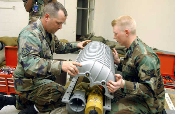VANDENBERG AIR FORCE BASE, Calif. -- Staff Sgt. David Sellers (left) and Airman Michael Woods finish assembling a hardened cable system cover during a missile maintenance team exercise, a Guardian Challenge event. The Airmen are part of the team from the 90th Missile Wing at F.E. Warren Air Force Base, Wyo. Guardian Challenge takes place here May 2 to 6 and tests the wartime readiness of teams representing each missile and space wing unit from Air Force Space Command. Competition events include timed exercises in missile-crew operations, missile and space maintenance, spacelift operations, space and missile communications, missile code controllers, helicopter operations, chefs and security forces. (U.S. Air Force photo by Senior Airman Karolina Gmyrek)