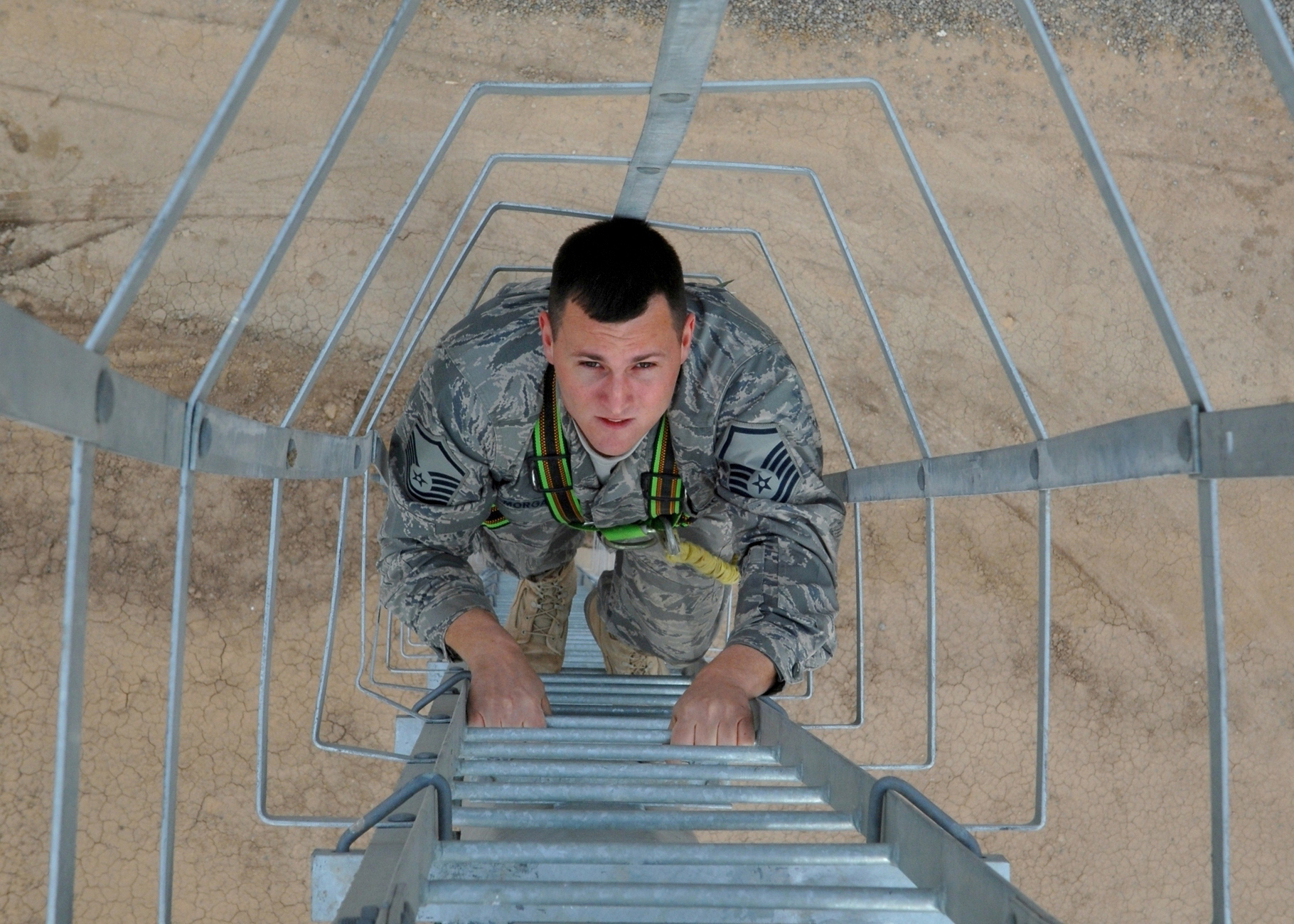 Master Sgt. Mark Morgan climbs a 100-foot light tower at Balad Air Base, Iraq, Feb. 25. He is an electrical systems technician deployed from Eglin Air Force Base, Fla. (U.S. Air Force photo/Senior Airman Julianne Showalter)