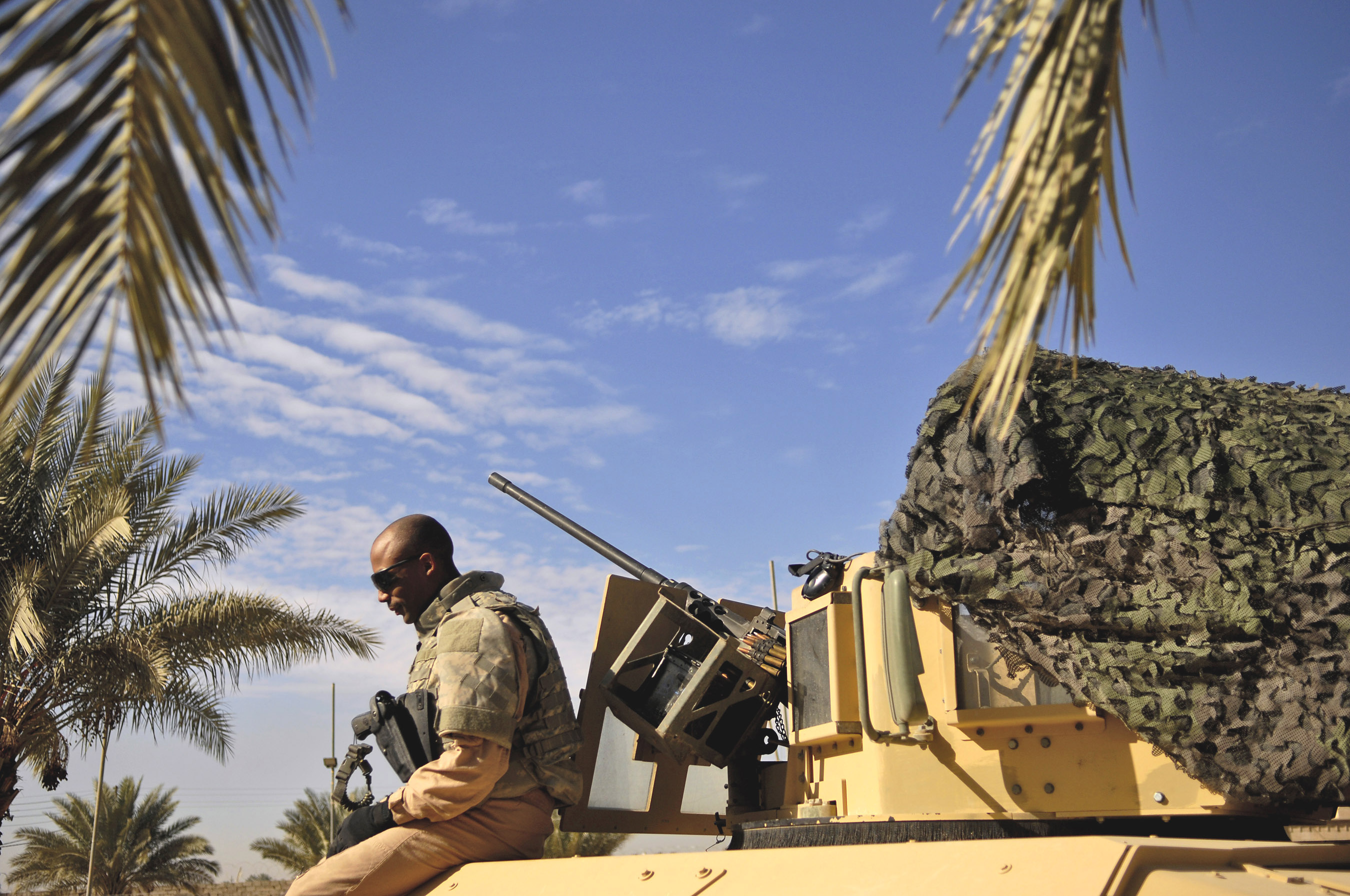 Senior Airman Juwan Young rests before patrolling sections of Rasheed, Iraq, Feb. 23. He is deployed to nearby Sather Air Base. (U.S. Air Force photo/Master Sgt. Andy Dunaway)